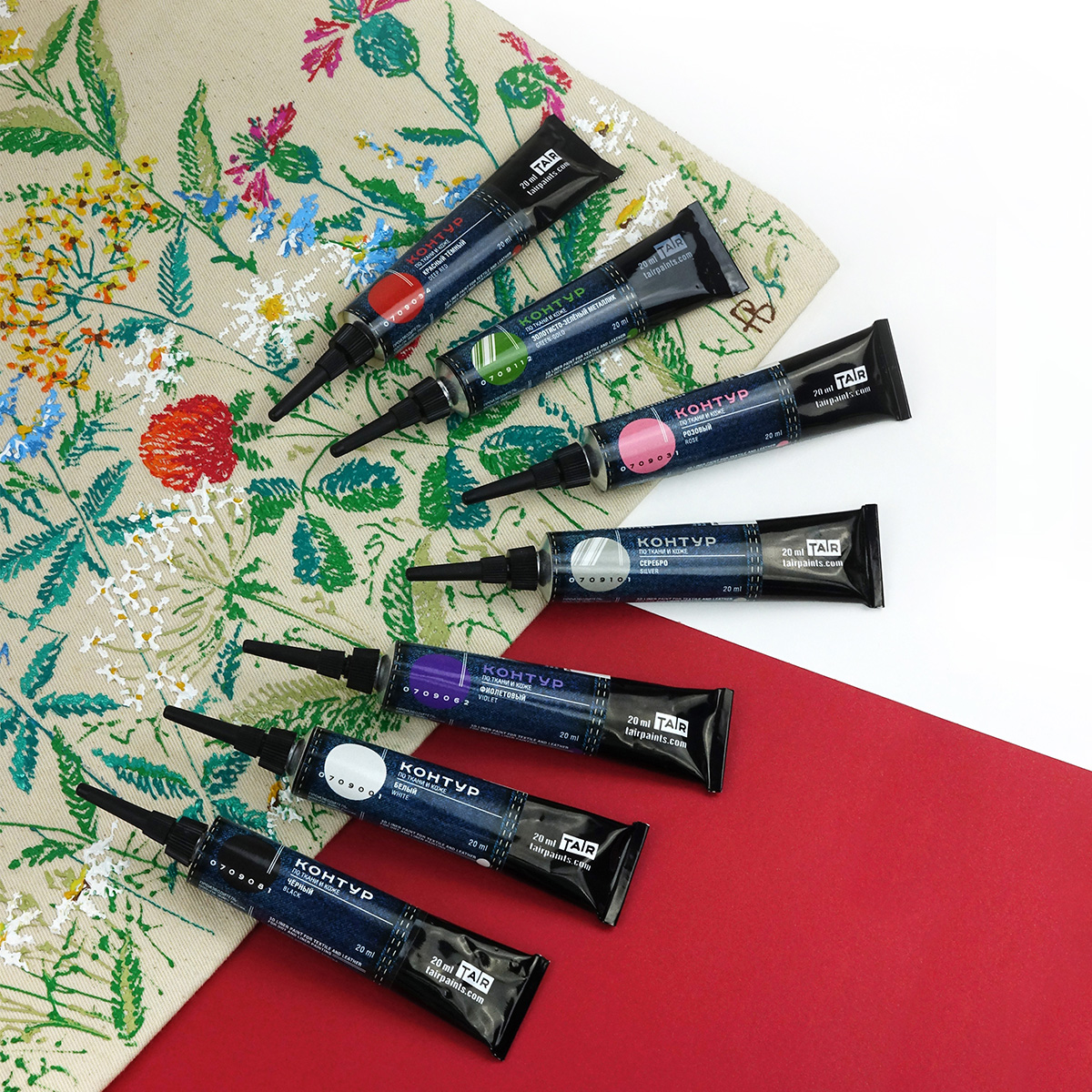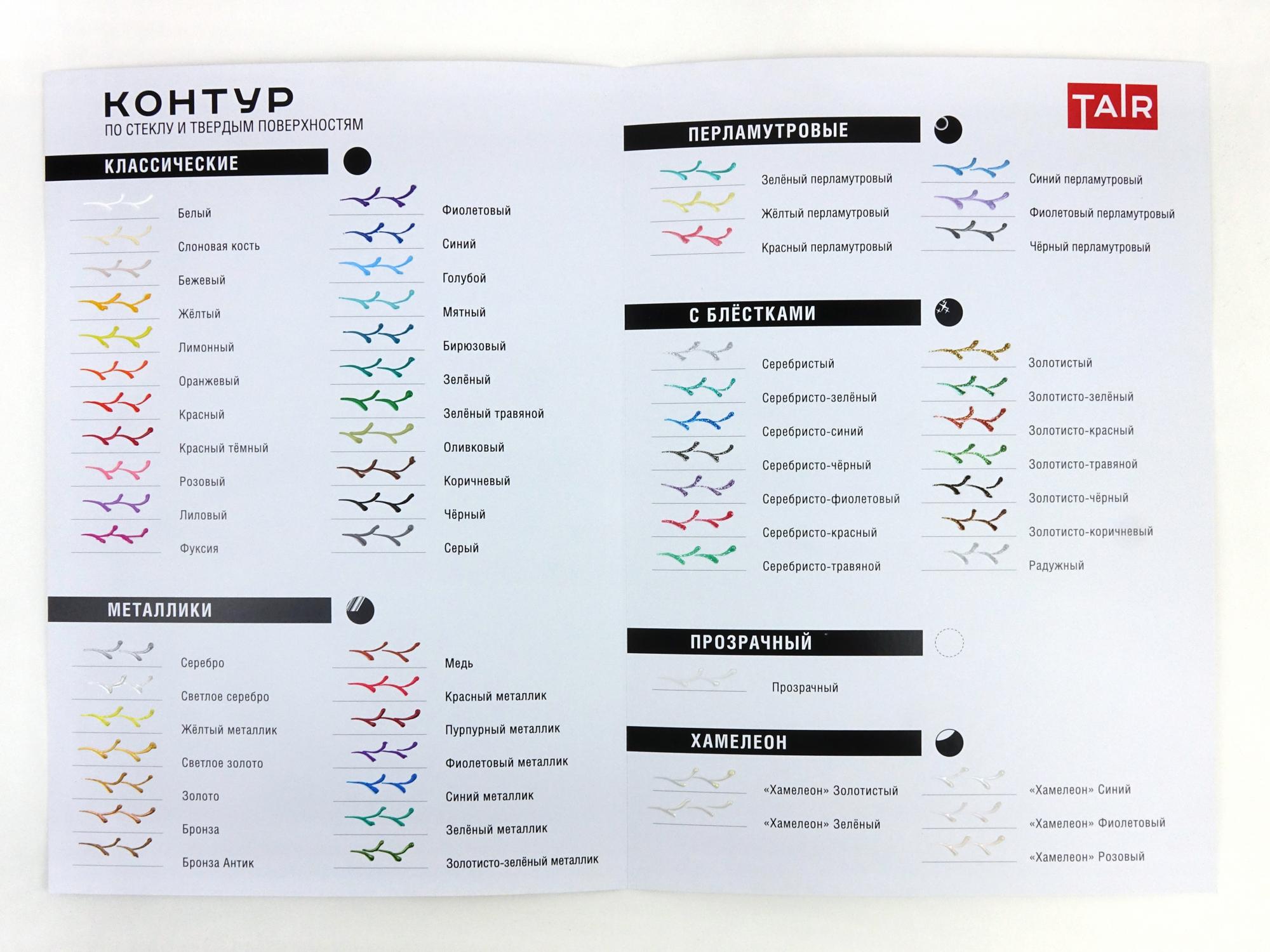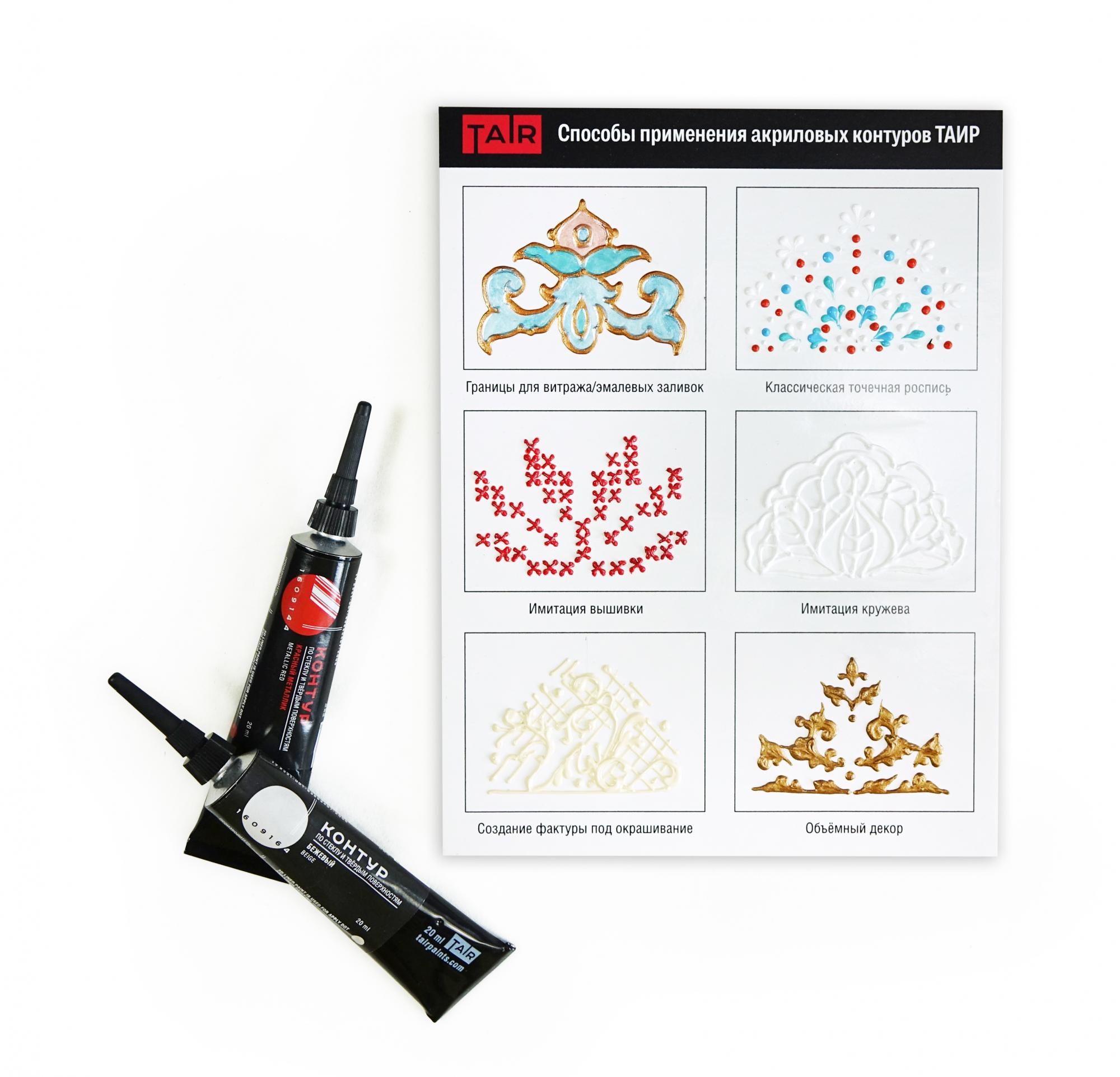 Контуры ТАИР — это акриловые краски в тубе с острым наконечником, которые наносятся прямо из тюбика. Предназначены для создания контурных и точечных рисунков на стекле, ткани и других поверхностях. Обладают высокой рельефностью и хорошо держат форму.