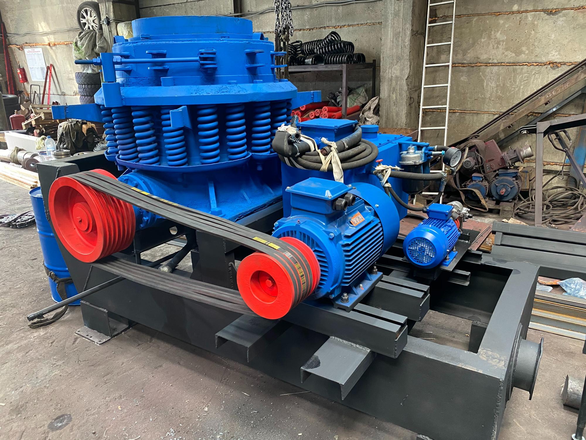 Конусная дробилка КСД-600 относится к оборудованию среднего и мелкого дробления и предназначена для переработки пород высокой прочности. Установка принимает сырьё с размером кусков до 90 мм, при этом ширина выходного отверстия составляет 12,35 мм. Дробилка оснащена двигателем мощностью 30 кВт и обеспечивает производительность до 40 м³/ч.