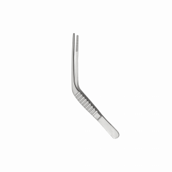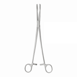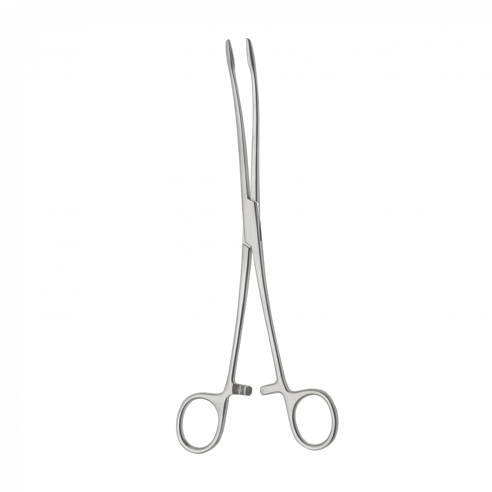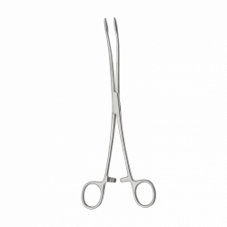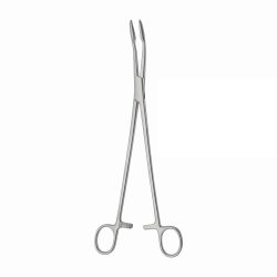 Хирургический инструмент с кремальерой, длинными изогнутыми браншами и овальными губками с насечкой.