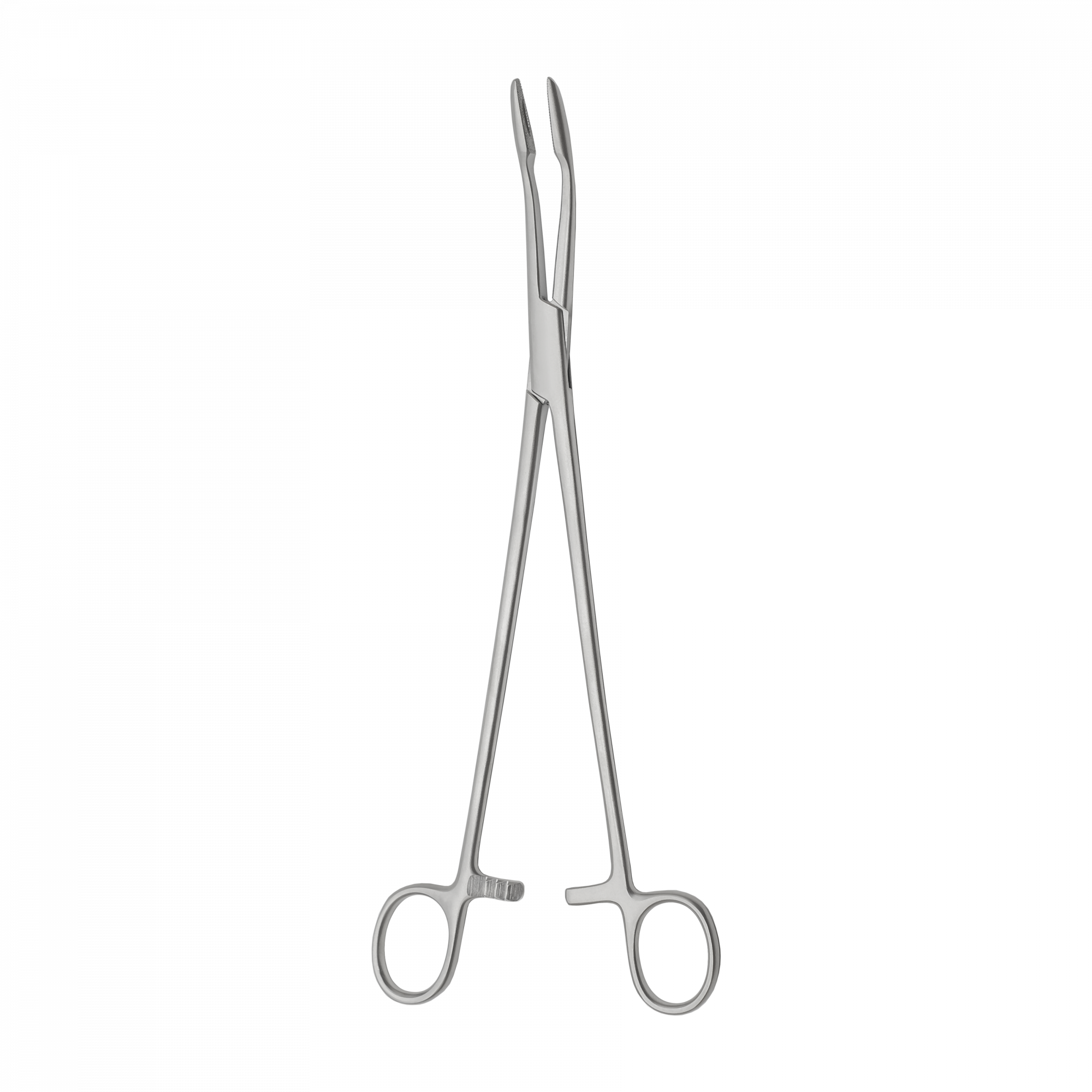 Хирургический инструмент с кремальерой, длинными изогнутыми браншами и овальными губками с насечкой.