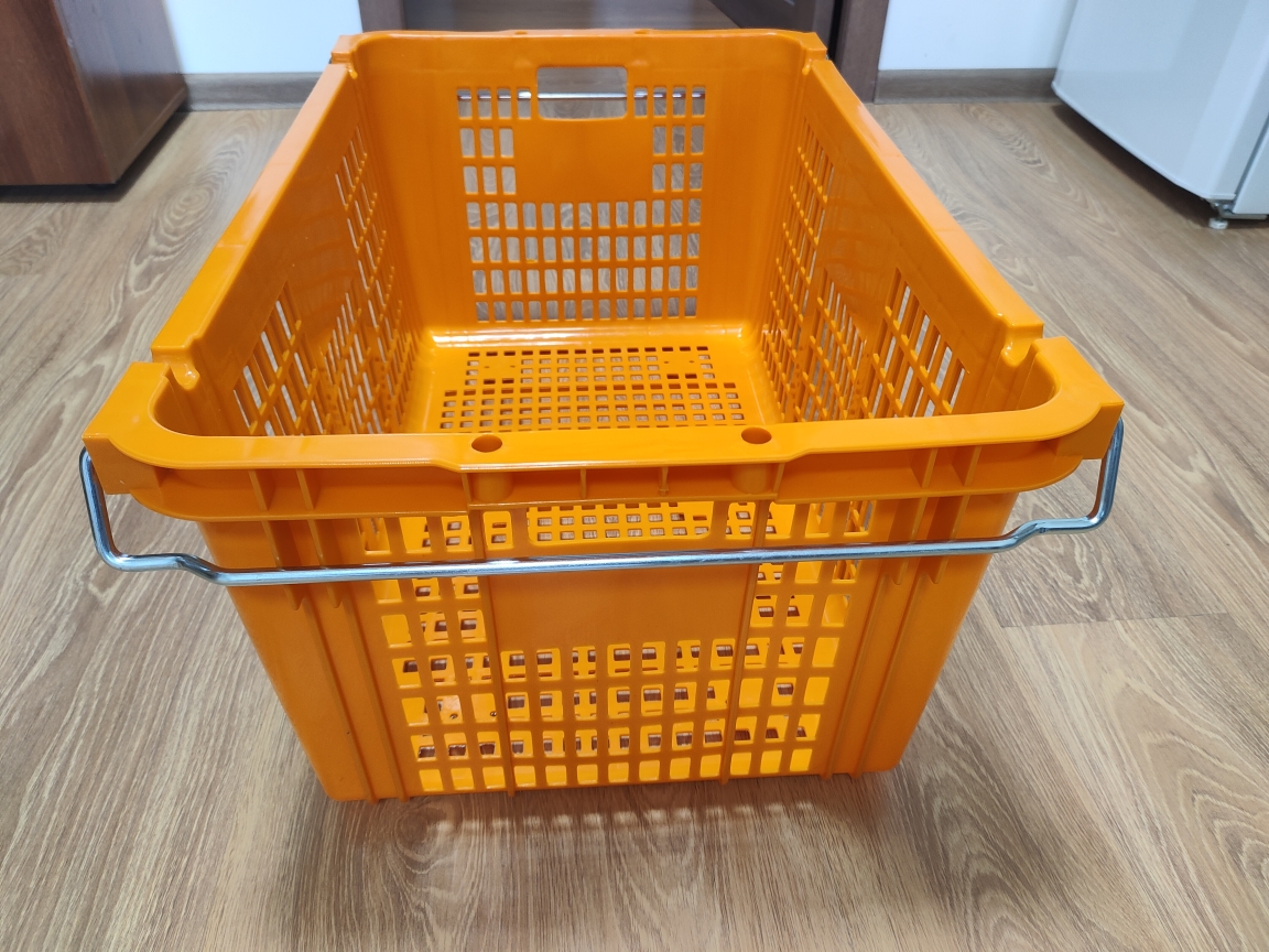 Надежные металлические ручки очень удобны для переноски а при установке их в транспортное положение позволяют ставить заполненные корзины друг на друга, не позволяя им соскальзывать и повреждать содержимое нижестоящей корзины. Изготовлены из пищевого полиэтилена(HDPE)