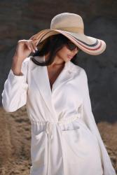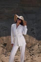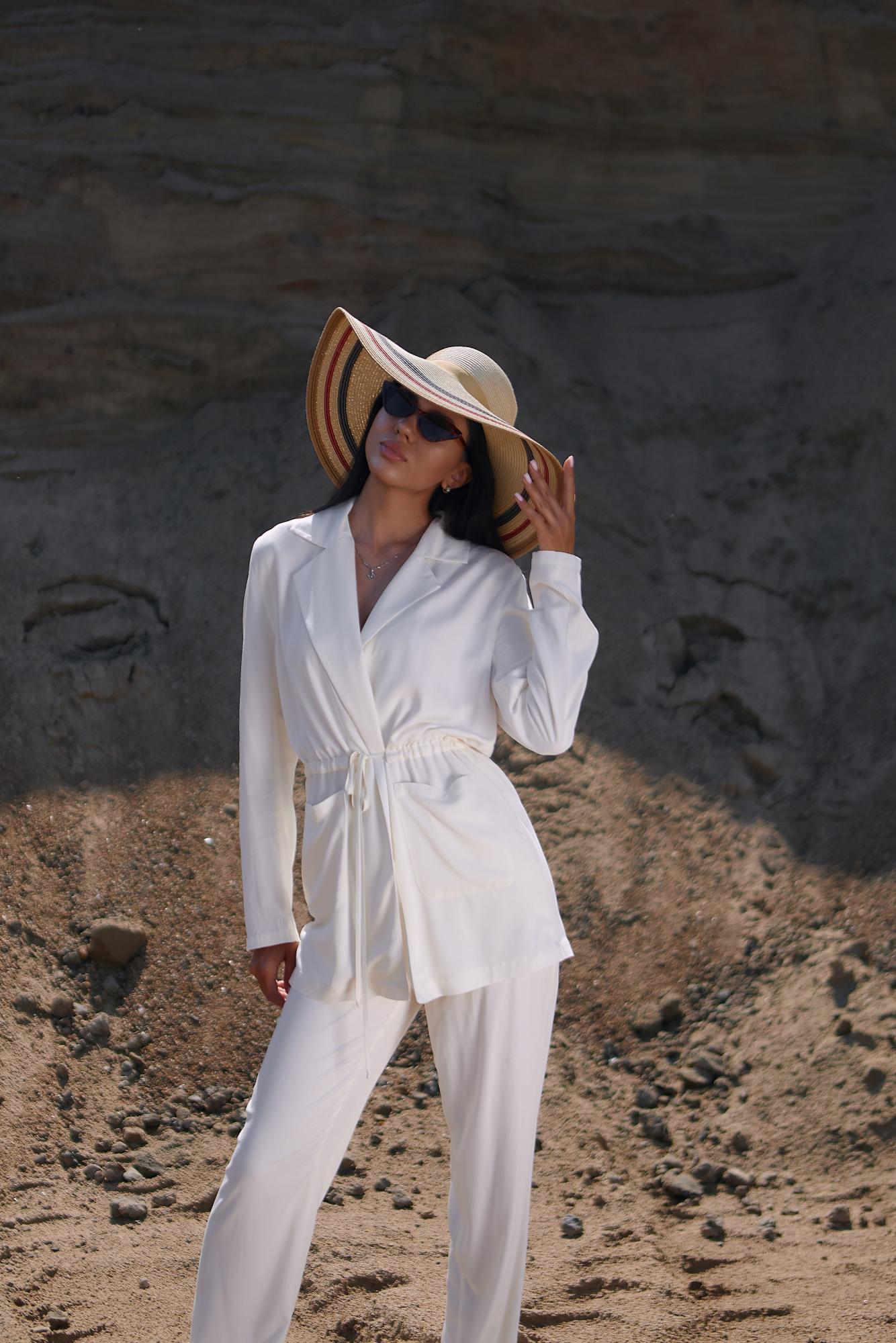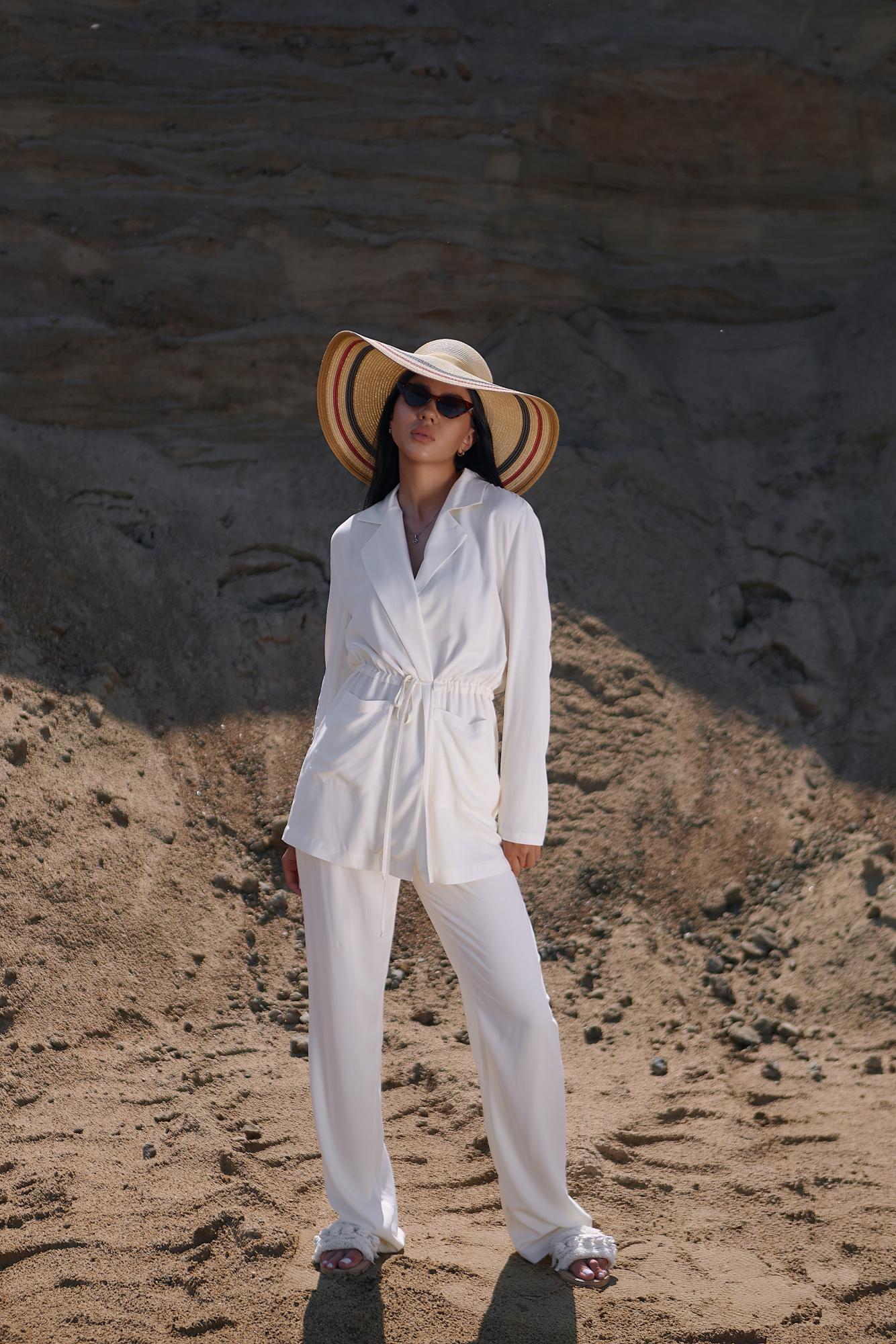 Брюки с комфортной резинкой на поясе и застежкой на пуговицу обеспечат идеальную посадку, а легкий жакет с кулисой на поясе подчеркнет вашу фигуру. Костюм подходит для жаркой погоды.