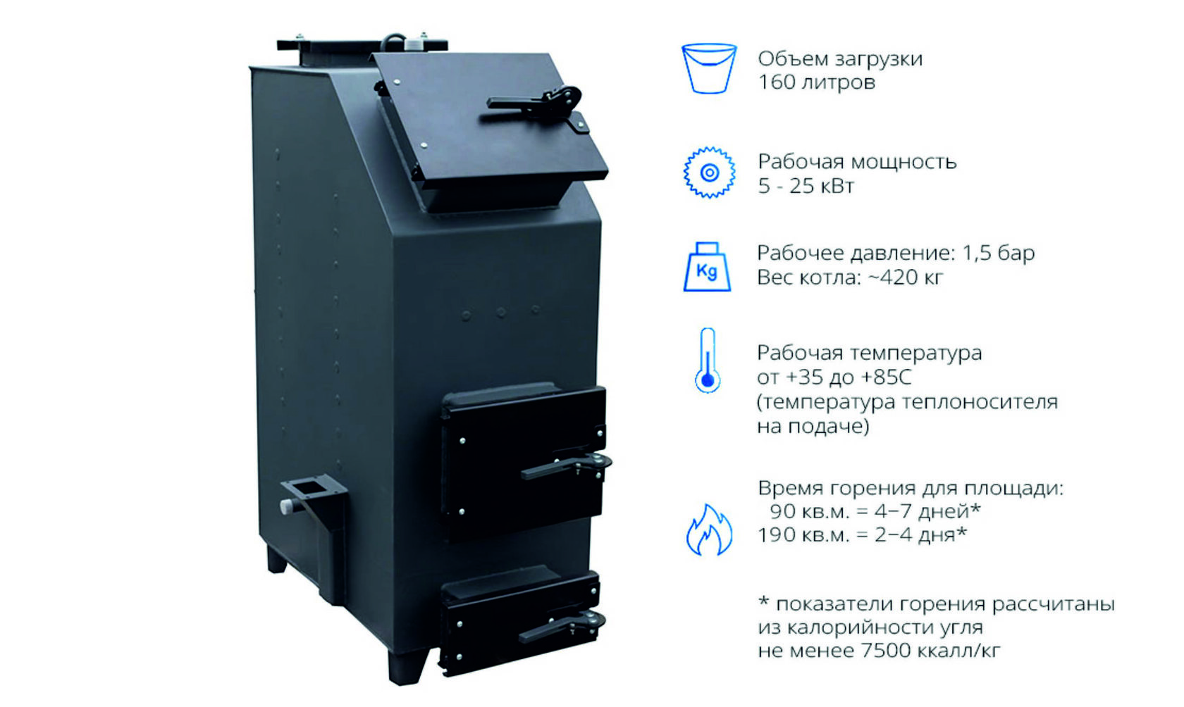 - Рабочая мощность в режиме длительного горения: 5−25 кВт