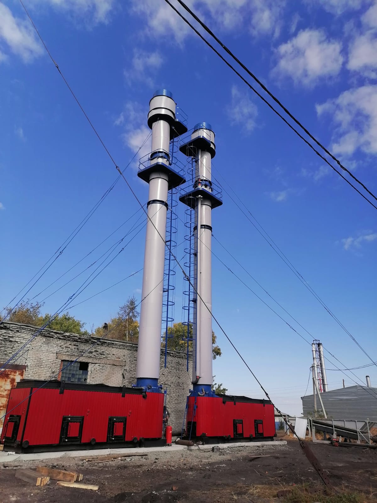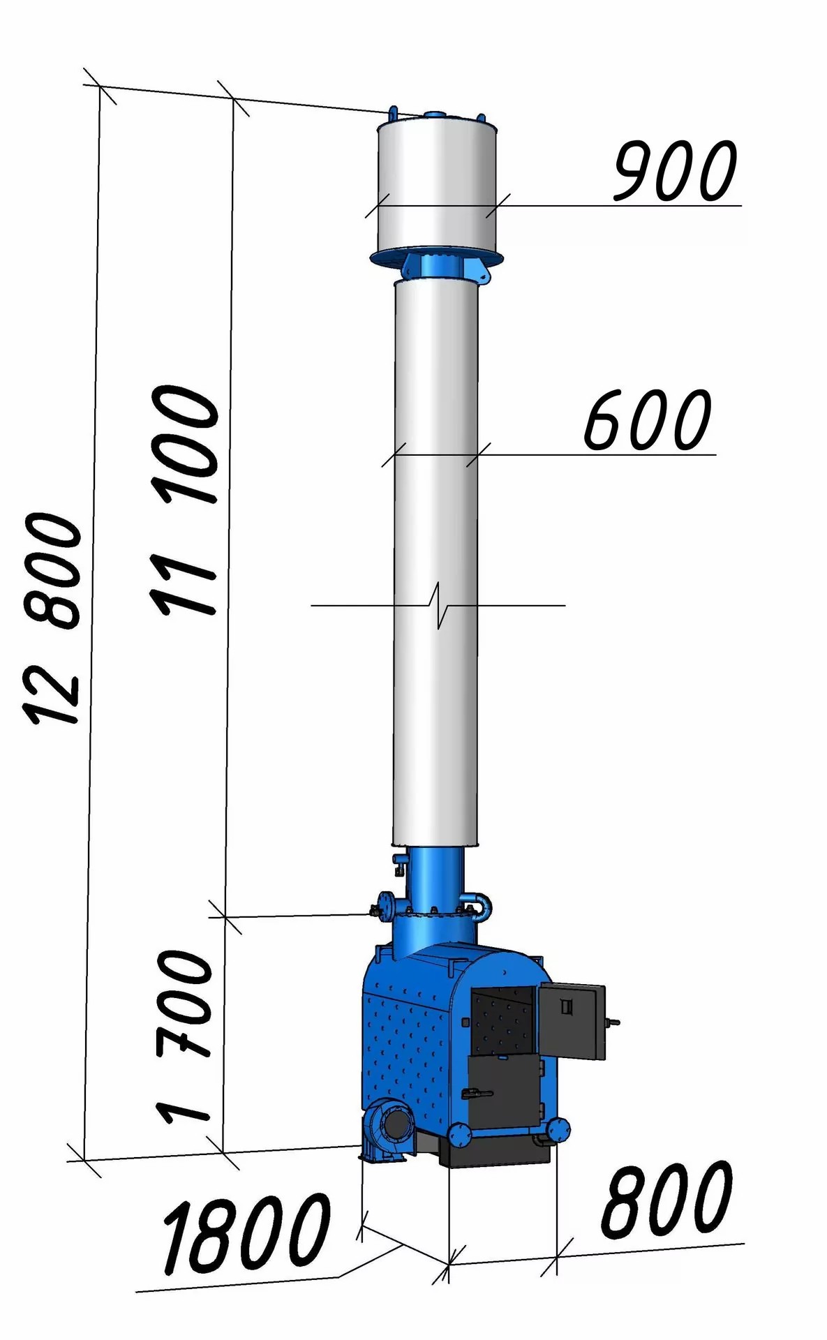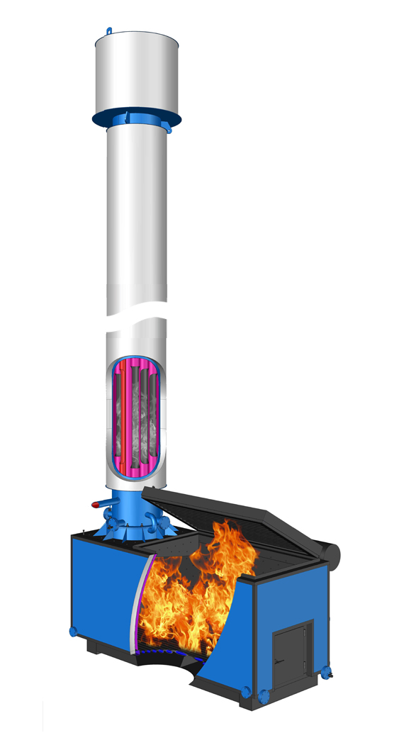 Уникальные твердотопливные котлы типа КВСрд состоят из топки и водоохлаждаемой дымовой трубы. Поднимаясь по дымовой трубе, горячие дымовые газы охлаждаются. отдавая тепло нагреваемой воде. Водоохлаждаемая дымовая труба выполняет роль основной конвективной поверхности котла, и имеет высоту 11м.Большая конвективная поверхность обеспечивает высокий КПД наших котлов-85%. Мощность котла 110 кВт,
