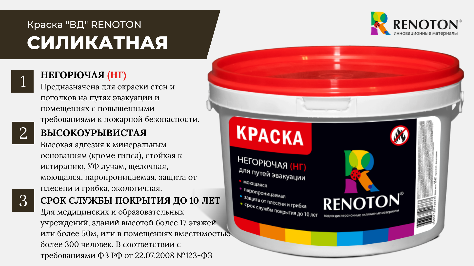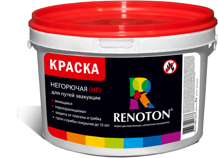 Для внутренних работ. Негорючая (НГ) дисперсионно-силикатная матовая, моющаяся краска предназначена для окраски минеральных фасадов (кроме гипсовых), а также стен и потолков на путях эвакуации и помещениях с повышенными требованиями к пожарной безопасности, в том числе медицинских и образовательных учреждениях, зданиях высотой более 17 этажей или более 50 м, или в помещениях вместимостью более 300 человек.