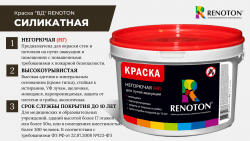 Применение: Краска является однокомпонентной и поставляется в готовом для нанесения виде. Наносится при температуре от +5 до +25 °C и при относительной влажности не более 60–80%. Перед нанесением краску следует тщательно перемешать и при необходимости разбавить ВД силикатным грунтом (водой) до рабочей вязкости, но не более 5% от общей массы. Краска наносится в 1–2 слоя с промежуточной сушкой. Первый тонкий слой наносится равномерно краскопультом, валиком с ворсом 5 мм (кроме поролоновых) или кистью от угла до угла «мокрое по мокрому» без подтеков и толстого слоя, на сухую подготовленную поверхность.