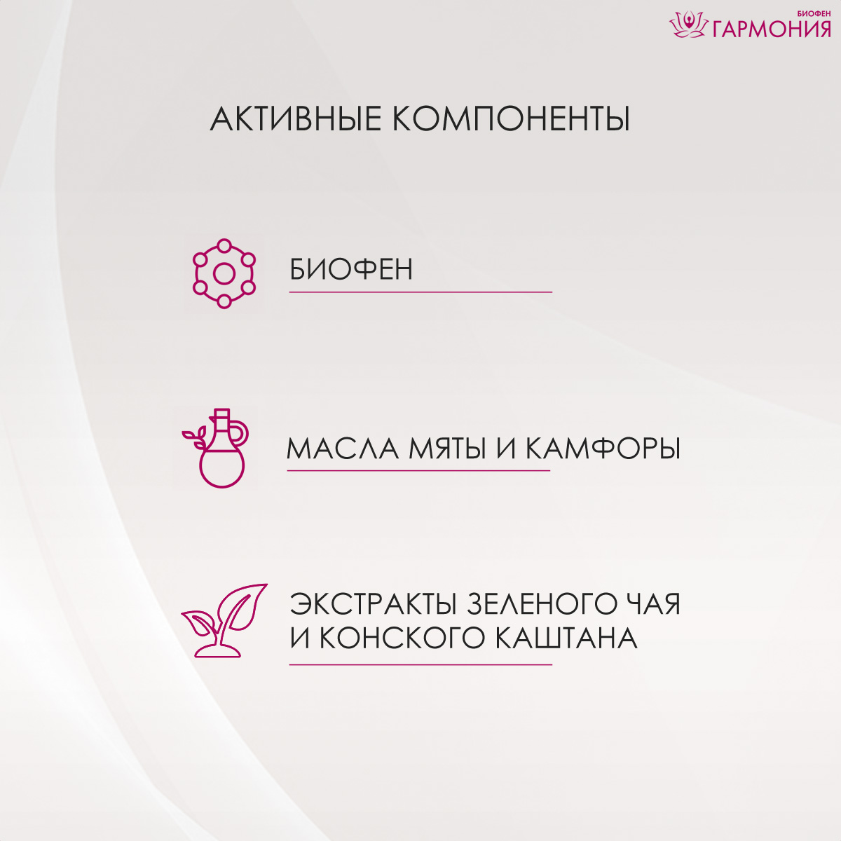 Состав: деминерализованная вода, 2-этилгексилкокоат, пальмет-2, цетеарет-22, изодецилнеопентаноат, глицерилстеарат, цетеариловый спирт, пропиленгликоль, каприлил диметикон, Биофен®, экстракт зелёного чая, экстракт конского каштана, масло камфоры, эфирное масло мяты, аллантоин, ПЭГ-7 глицерил кокоат, феноксиэтанол, этилгексилглицерин, отдушка.