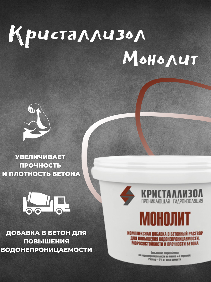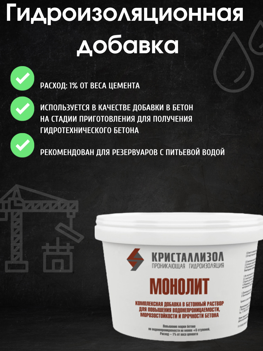 Марка бетона, в который планируется добавлять Кристаллизол Монолит в качестве добавки для повышения его водонепроницаемости должна быть не ниже М150.
