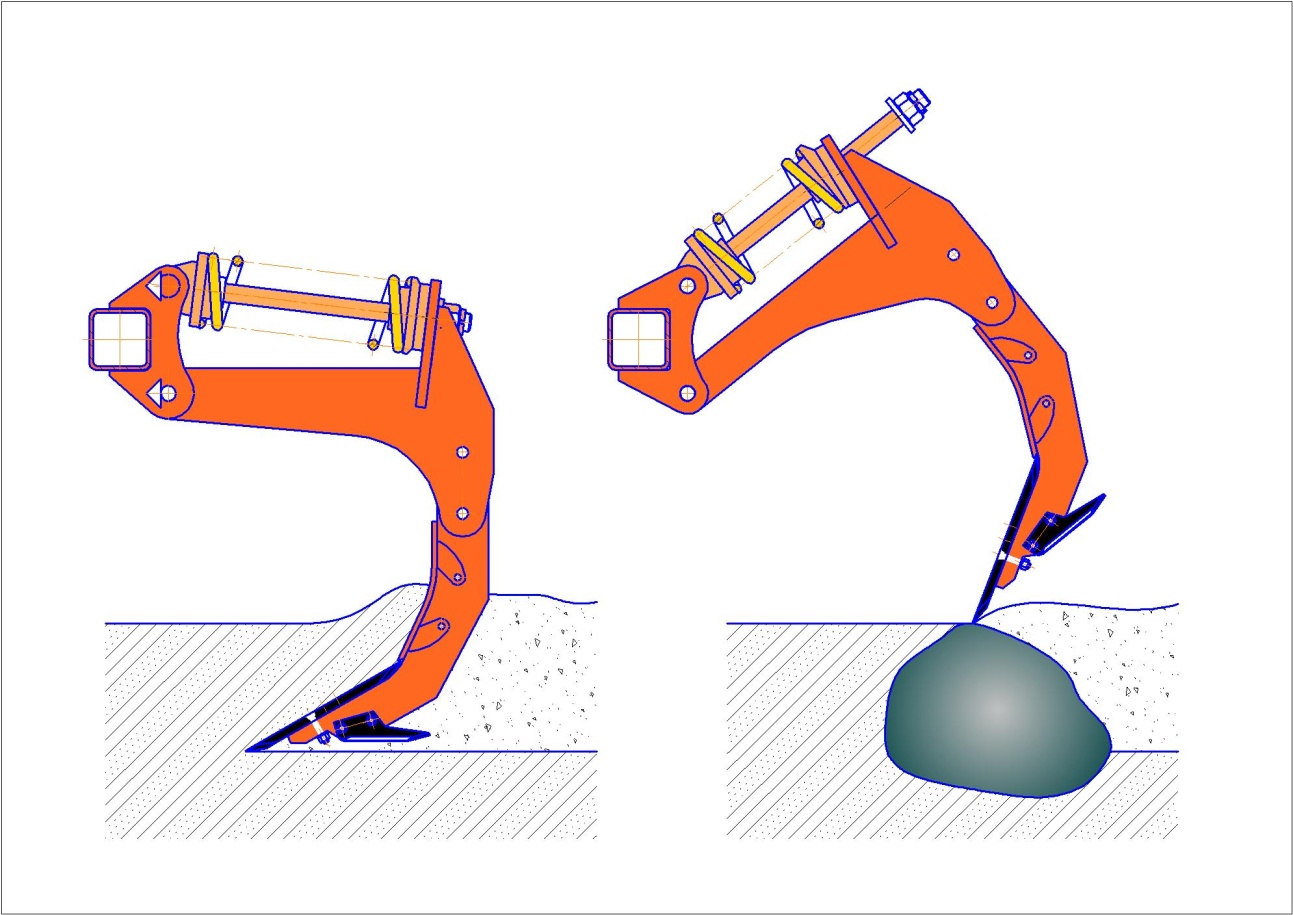 Наличие пружинной защиты стоек позволяет использовать КСТ на каменистых почвах. В случае наезда культиваторной лапы на непреодолимое препятствие, стойка вместе с лапой подымается вверх, объезжая препятствие. Возврат в рабочее положение осуществляется автоматически под воздействием пружины.