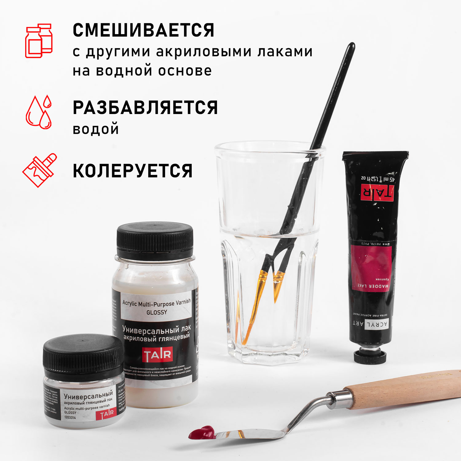 В ассортименте бренда ТАИР также представлены другие виды лаков: универсальный, финишный, акрил-фисташковый, даммарный, декупажный, кракелюрный, битумный, шеллачный, для кожи.