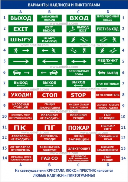 Стандартный набор надписей и пиктограмм соответствует нормам аварийного освещения (размер и форма символов, цвет фона). Доступно изготовление светоуказателей с любыми изображениями и надписями на заказ.
