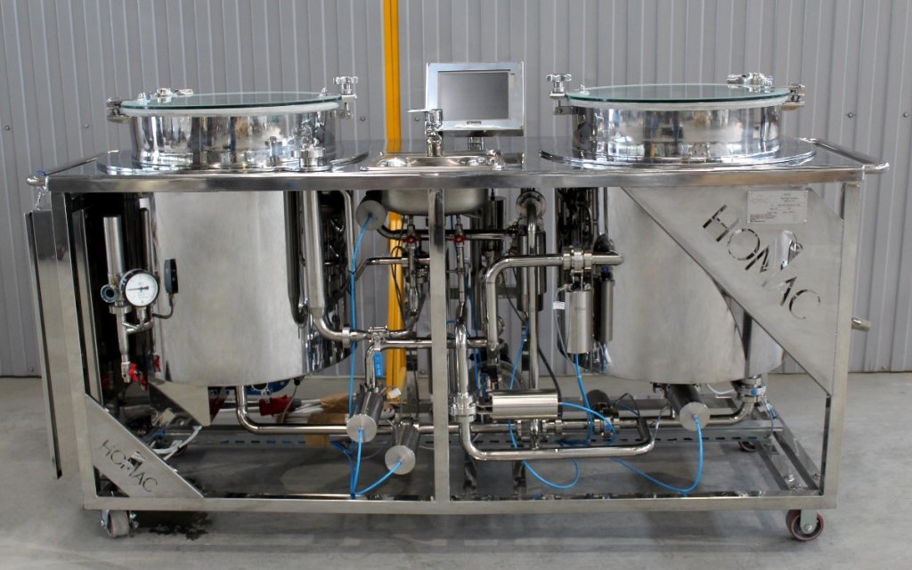 Микропивоварня «НОМАС», 100 л — компактная пивоваренная установка для затирания, варки и брожения пива. Объём холодного сусла за варку — 100 литров; до 3 варок в сутки, до 400 л готового пива в месяц.