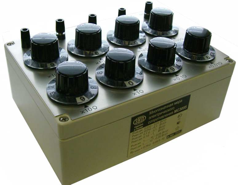 Многозначная мера электрического сопротивления (ММЭС) предназначена для применения при проведении поверочных и калибровочных работ в цепях постоянного тока, а также исследовательских работ в цепях постоянного и переменного тока. Конструктивно выполнена в пластмассовом корпусе, на верхней панели которого размещены восемь декадных переключателей и зажимы для подключения меры и электростатического экрана.