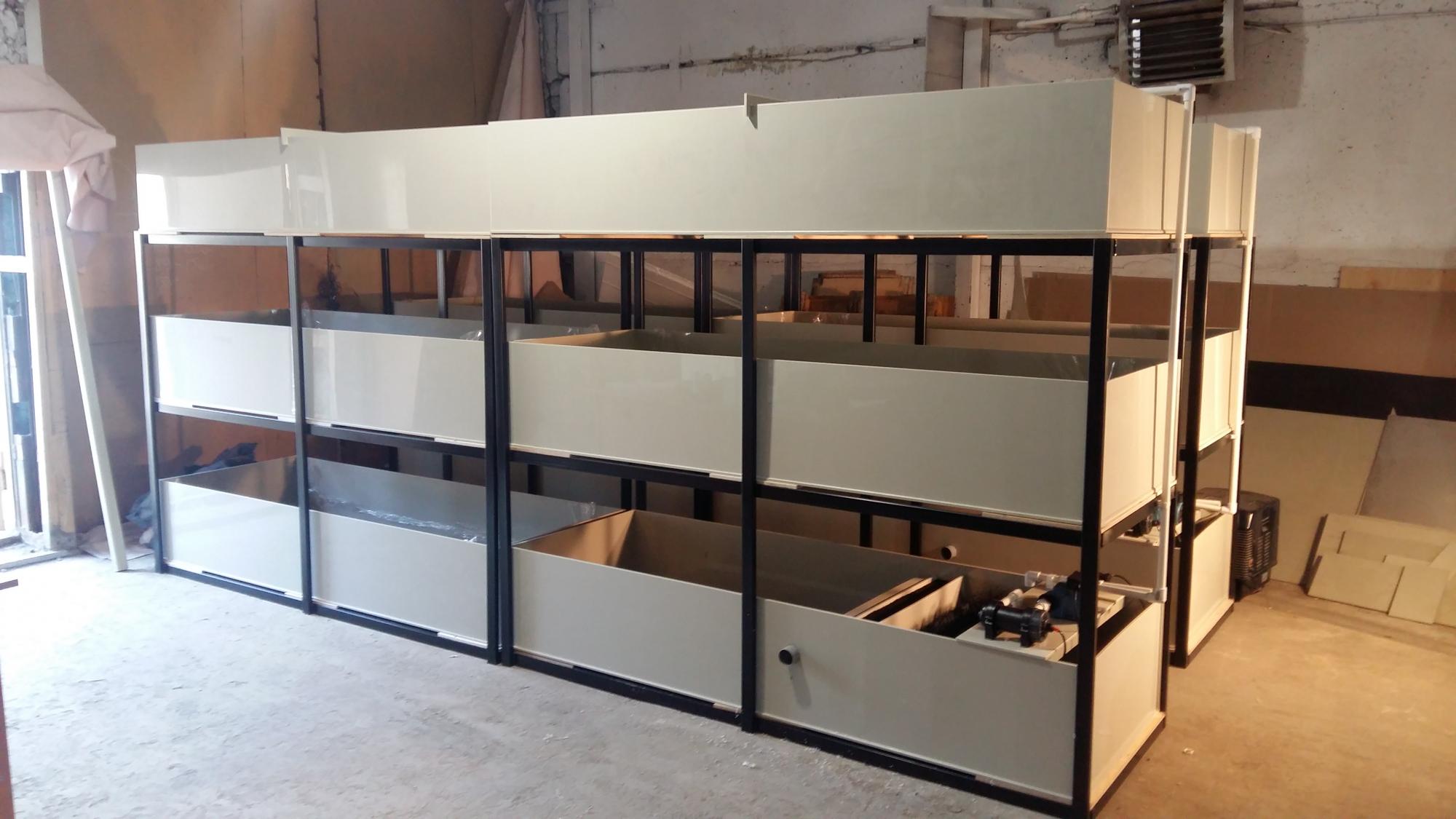 Модули для выращивания креветок; представляющие собой, стойку в виде шести емкостей сдвоенных между собой , прямоугольной формы, выполненных из полипропилена толщиной 8 мм. (марка VIKULEN) и размещенных на трёх уровнях металло-каркаса. Модуль автономен полностью, но позволяет включить неограниченное кол-во дополнительных модулей с подключением оборудования водоочистки и водоподготовки. Модули УЗВ сконструированы таким образом, чтобы обслуживание и уход были минимальными. Учитывая автоматическую работу системы циркуляции, ее техническое обслуживание сводится только к периодическому визуальному контролю.