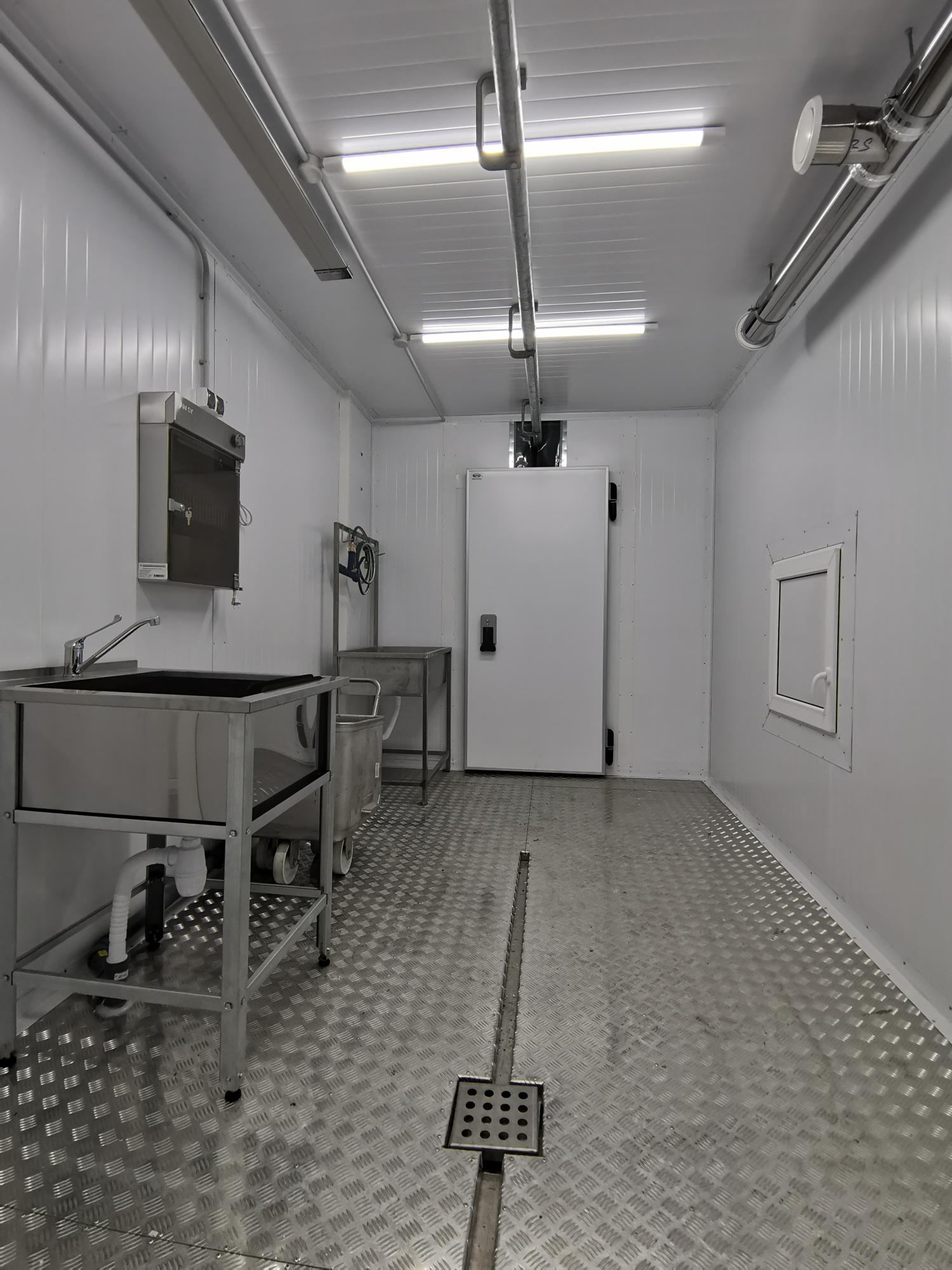Бойня производится на базе 40 и 20 футовых контейнеров, поставляется в готовом виде, устанавливается на фундамент, свайное поле или сани (что облегчает транспортировку модулей).