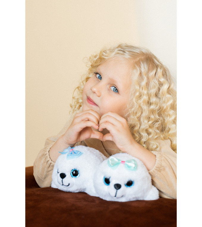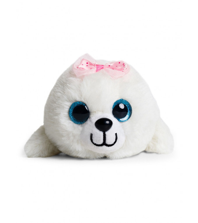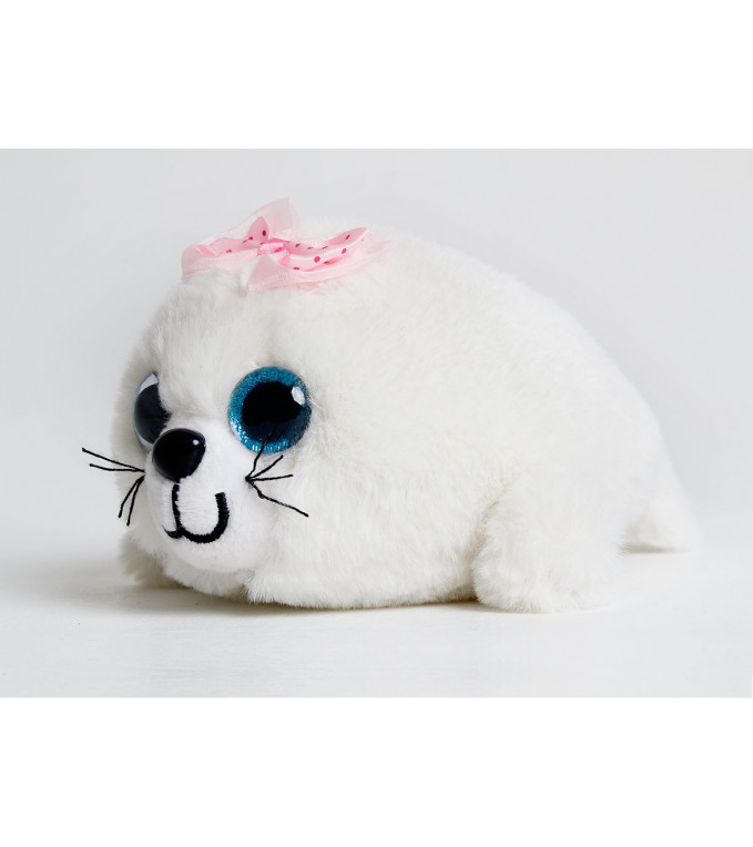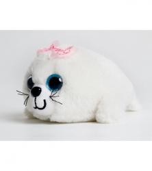 Полностью соответствует своему имени - пушистая, яркая игрушка с цветным бантом на голове. Большие голубые глаза и велюровый нос контрастируют с белой улыбчивой мордочкой. За счет нестандартного для нерпы окраса имеет мультяшный вид, это привлекает внимание детской аудитории.