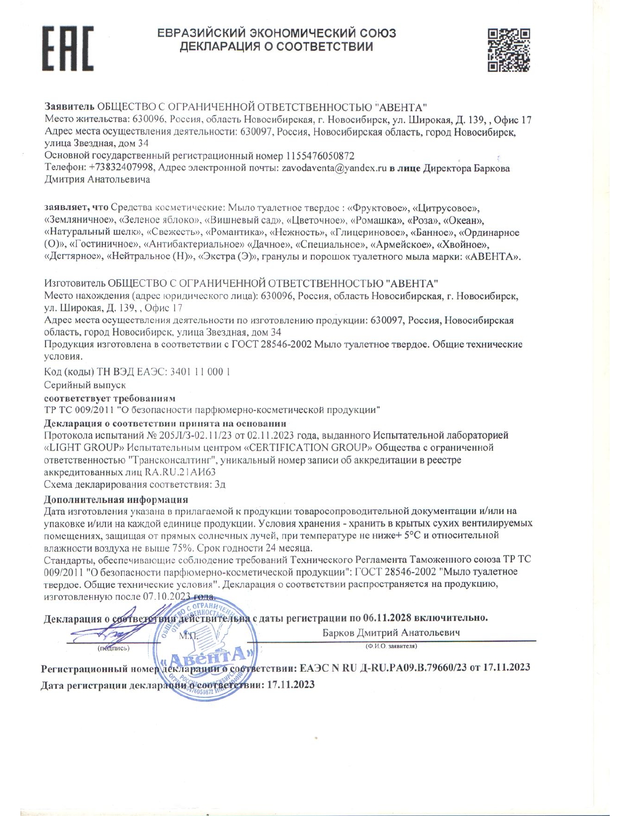 Мыловаренный Завод «Авента» является производителем «Хозяйственного и «Туалетного» твердого мыла из натуральных животных и растительных жирных кислот без консервантов и красителей, по рецептуре советских времен согласно ГОСТа: мыло хозяйственное ГОСТ 30266-2017, мыло туалетное ГОСТ 28546-2002, а также мыльная стружка.