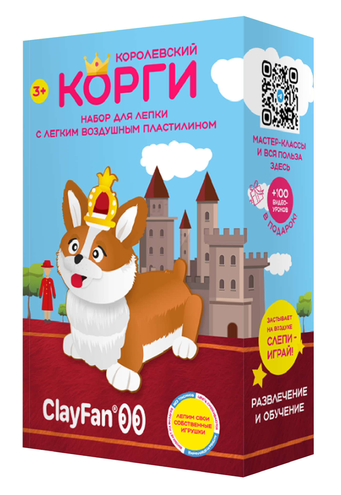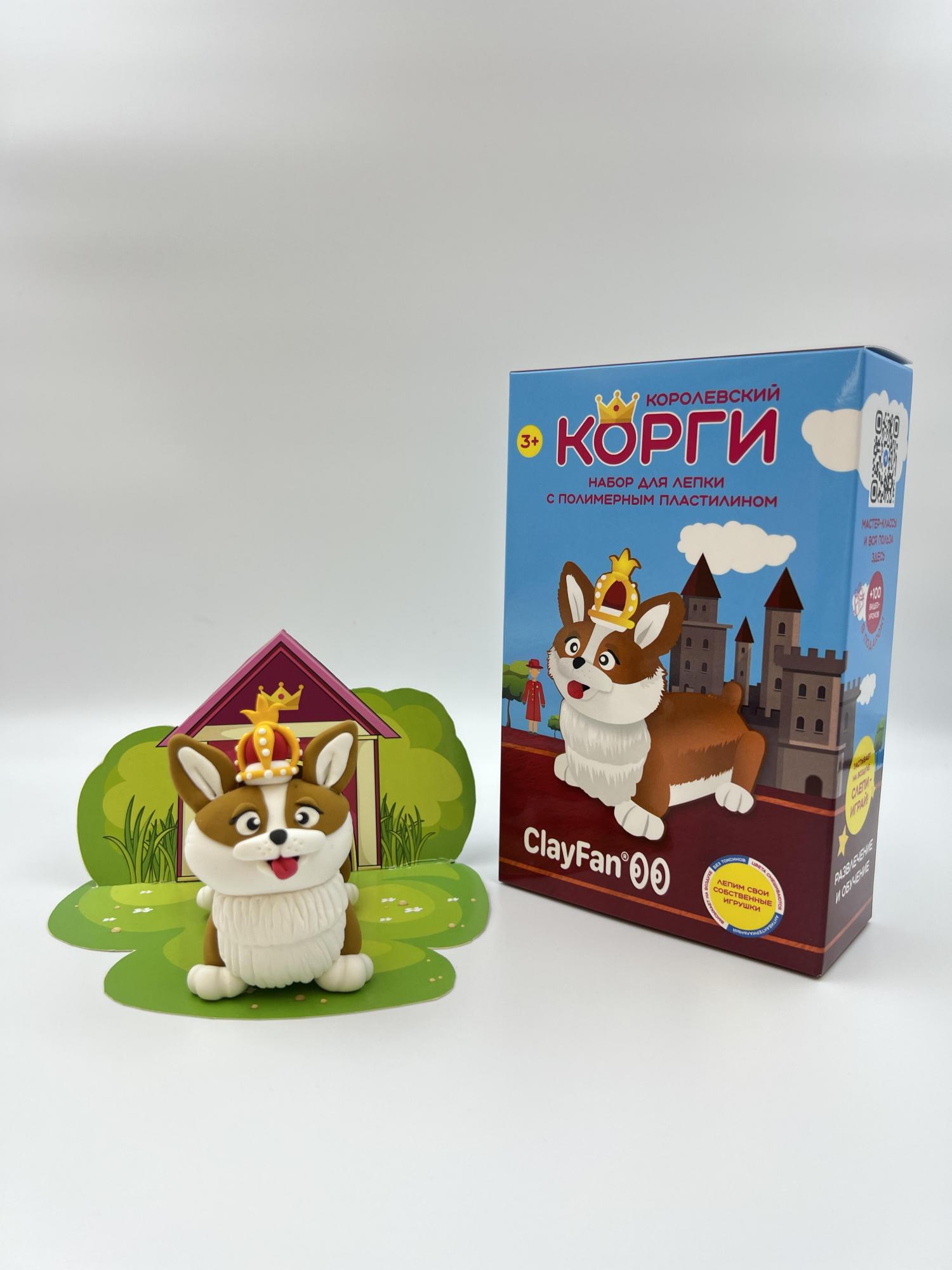 Набор "Корги". Картонная упаковка. В упаковке 6 брусков пластилина, 3D картонный конструктор, основная инструкция, инструкции к персонажу, 1 стек, 1 зип пакет для хранения. Онлайн-школа с уроками по лепке в подарок.