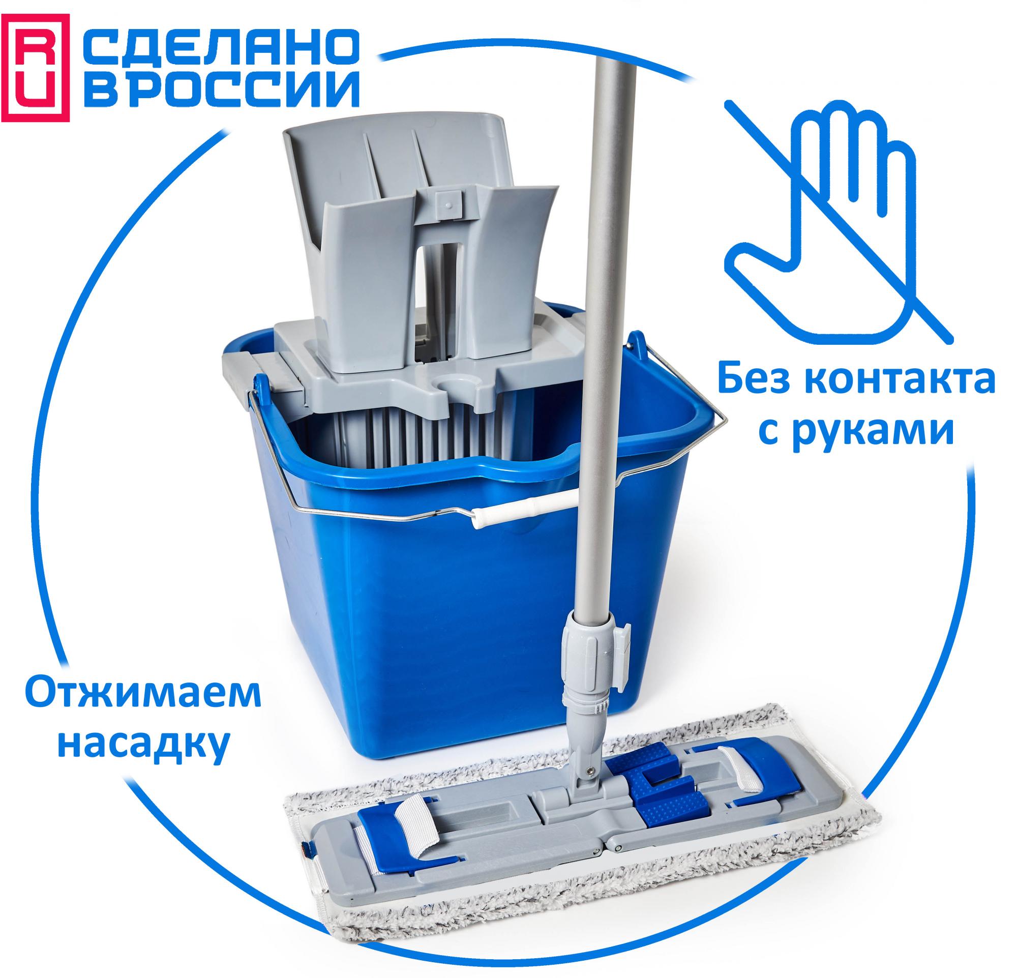 Комплект для уборки помещений ( до 200 кв.м.) состоит из ведра 20л, бесконтактного отжима и швабры с насадкой. Рукоятка не входит в комплект и докупается отдельно. В зависимости от выбранной рукоятки мы коплектуем двумя видами держателей под "итальянскую" резьбу (бытовой вариант использования) или цанговую гайку на профессиональную рукоятку 22-24 мм.