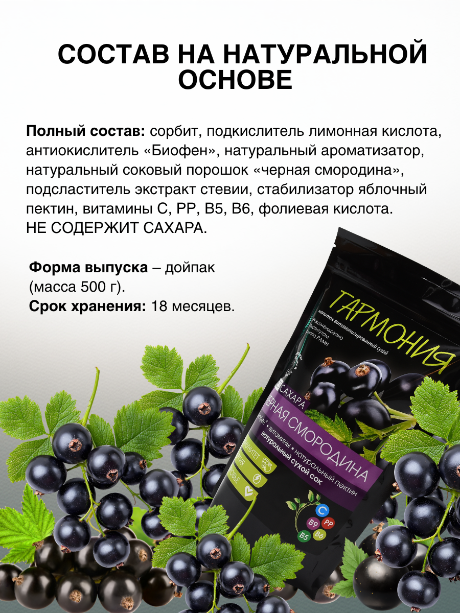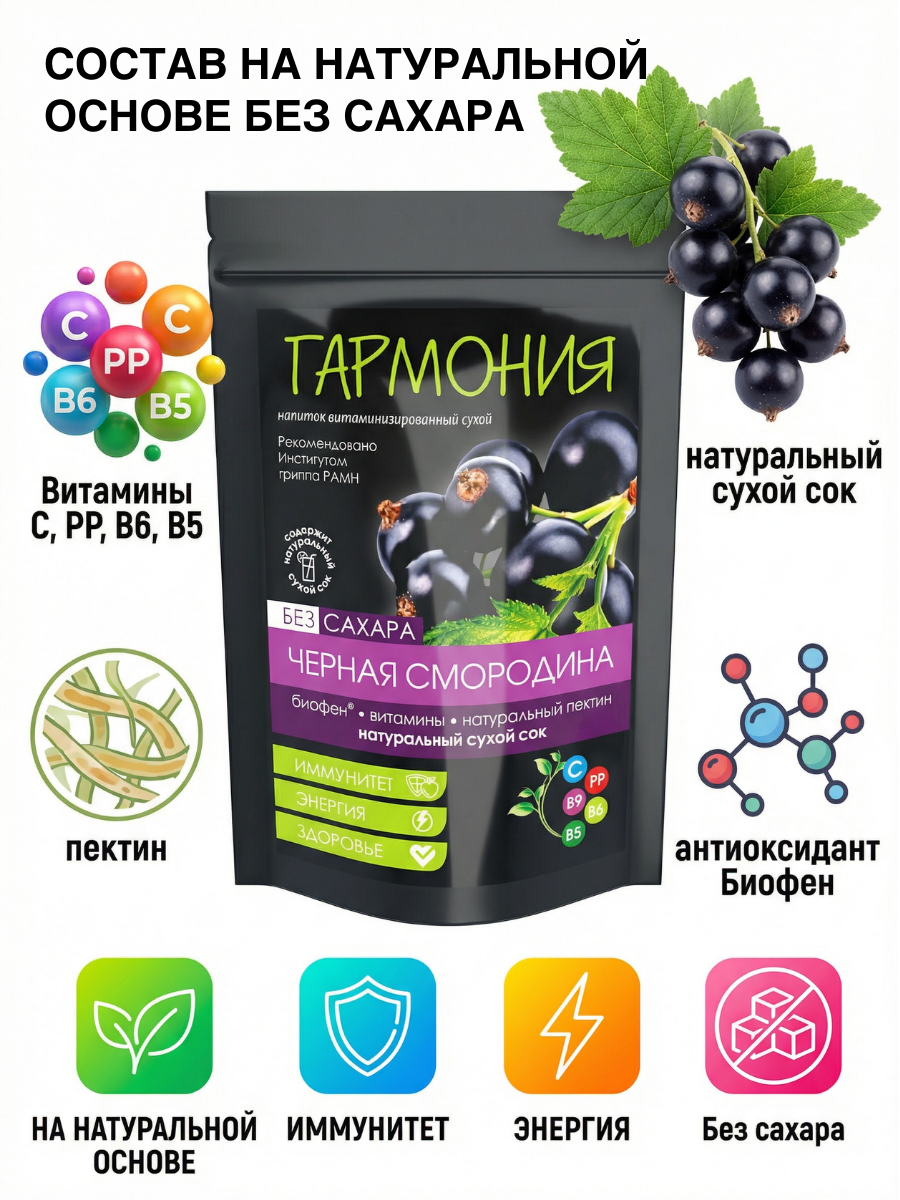 Благодаря тщательно подобранным компонентам, быстрорастворимый напиток обладает многофункциональным действием – укрепляет иммунитет, поддерживает работу пищеварительной системы, быстро наполняет энергией, улучшает адаптационные возможности организма. Сухой напиток содержит эффективный антиоксидант-антигипоксант Биофен® – продукт высокотехнологичного синтеза, совместная разработка Института гриппа и ООО «ГАРМОНИЯ». Биофен® защищает организм от оксидативного стресса, создает щит, который ограждает клетки от повреждений, попадания в них вирусов и возникновения воспалений, способствует нормализации энергетических и обменных процессов, выступает в роли стимулятора иммунных реакций. Витамины участвуют в синтезе иммунных клеток, антител, нормализуют обменные процессы. Сухой сок является источником важных питательных веществ, а яблочный пектин богат пищевыми волокнами.