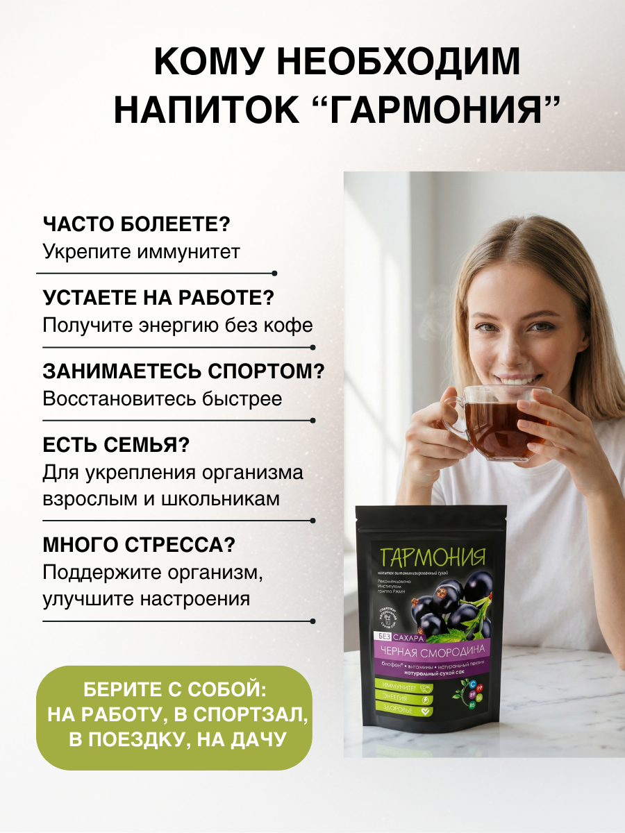 Полезный растворимый напиток «Гармония» с Биофеном® рекомендуется: для общего укрепления организма и поддержки иммунитета; при сезонном недостатке витаминов и профилактики простудных заболеваний; при хронической усталости; во время болезни для ускорения выздоровления; при физических нагрузках (работы по дому, на даче, спорт) как быстрый источник энергии.