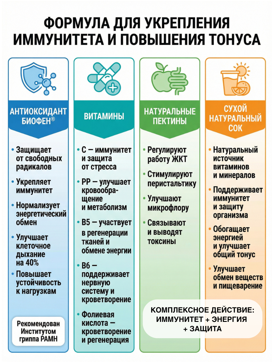 Совет: для максимального эффекта рекомендуется регулярное применение, особенно в период повышенной заболеваемости и при высоких нагрузках.