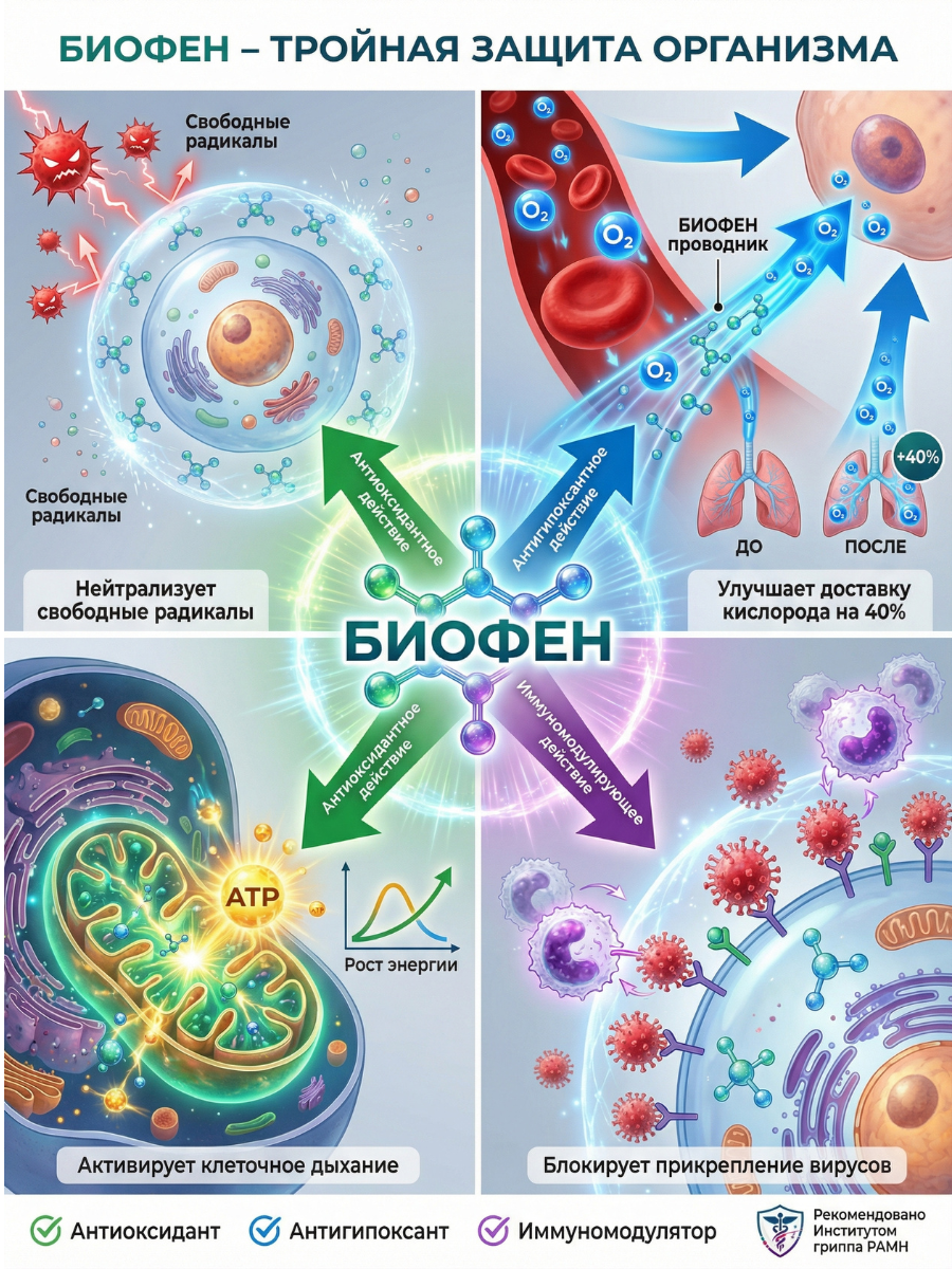 Укрепляет иммунитет. Напиток повышает устойчивость к инфекциям, вы меньше болеете, легче переносите заболевания и сокращаете период выздоровления. Напитки «Гармония с Биофеном® рекомендованы Институтом гриппа РАМН.