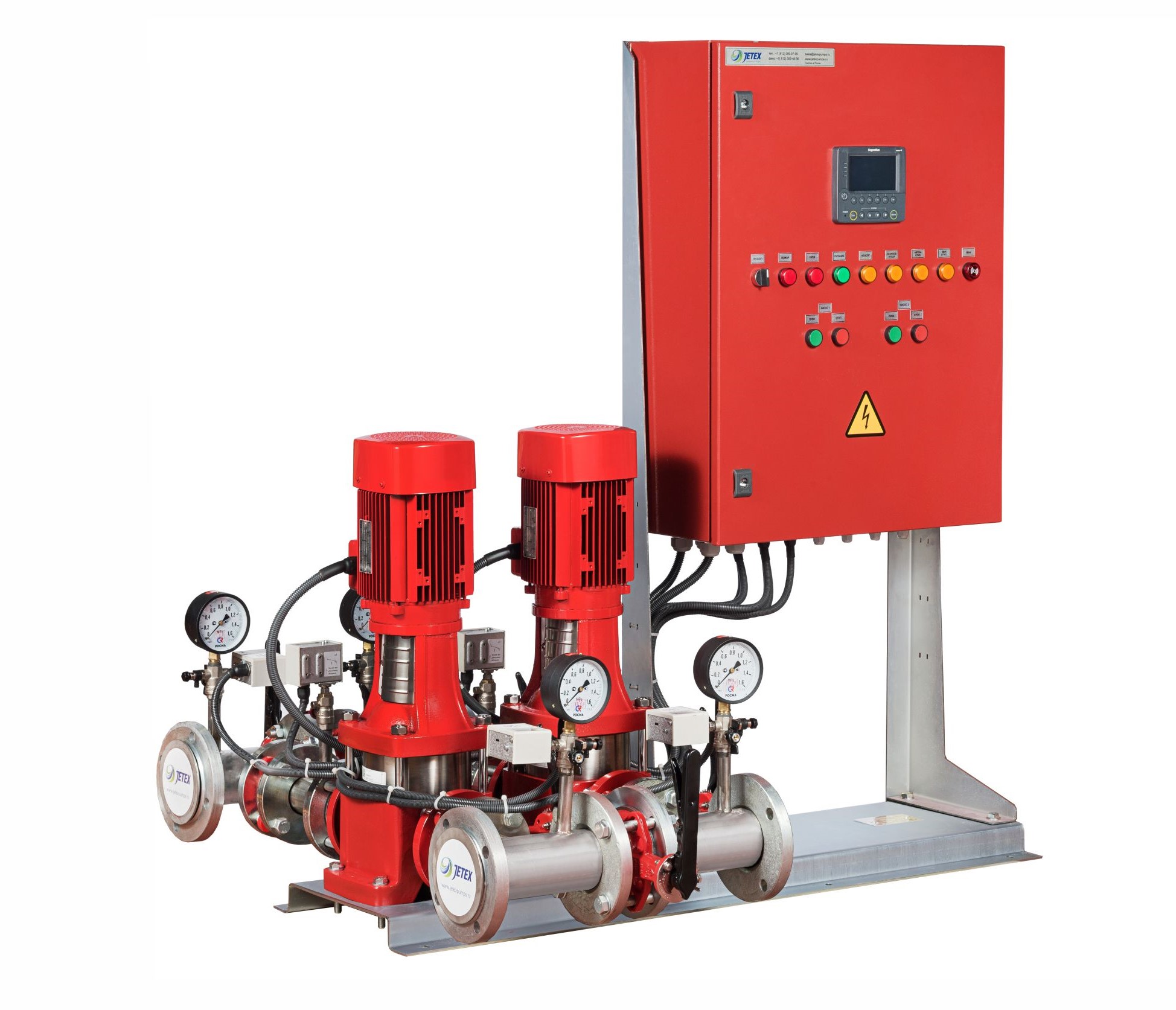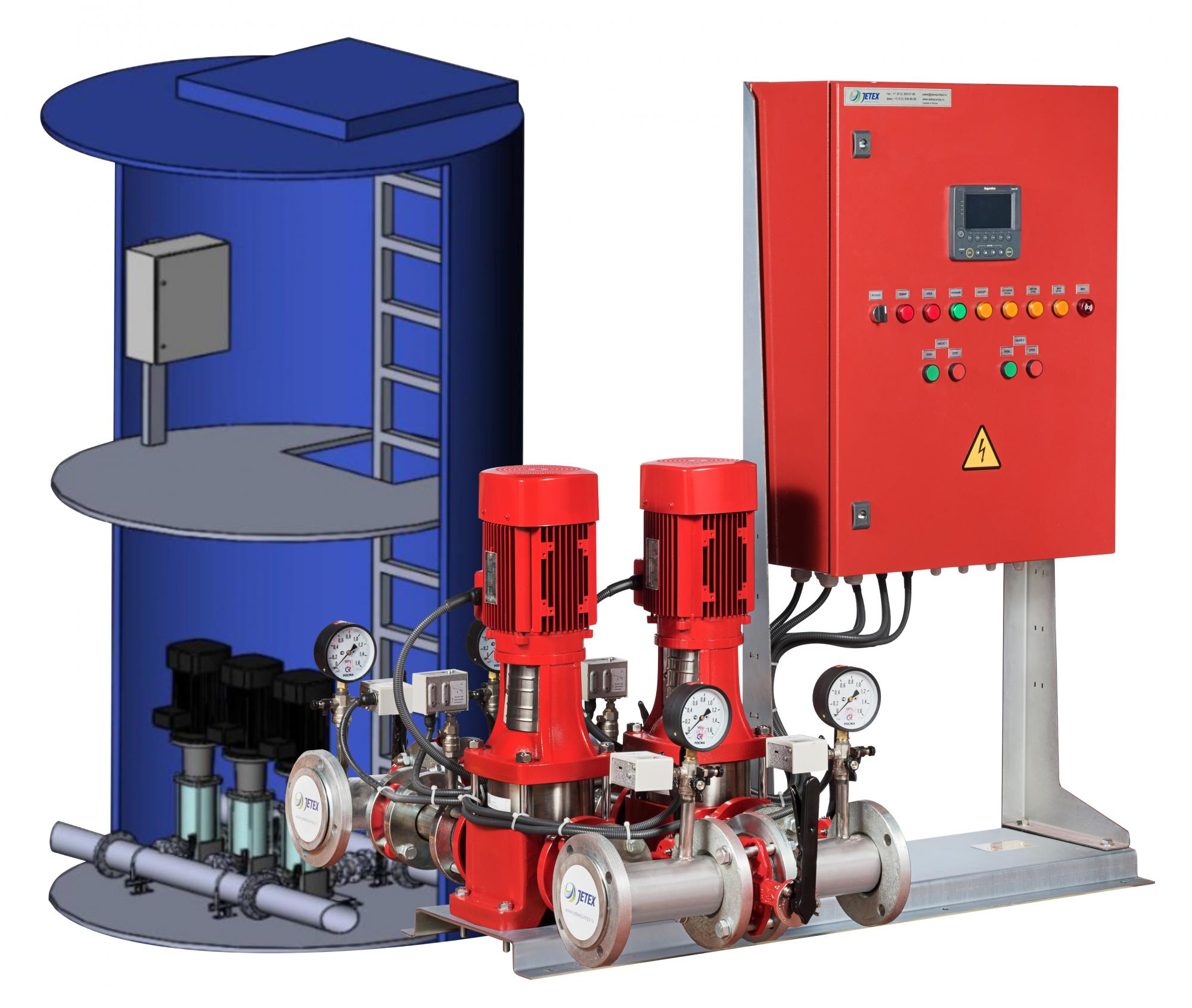 Насосные станции пожаротушения JETEX VF собственного производства. Доступные цены. Высокий КПД. Различная комплектация 1-6 насоса, со шкафом управления, с жокей-насосом. Частотное регулирование. Исполнение наземное, подземное, в блок боксе - под Ваше ТЗ. Доставка по РФ, гарантия, сервис.