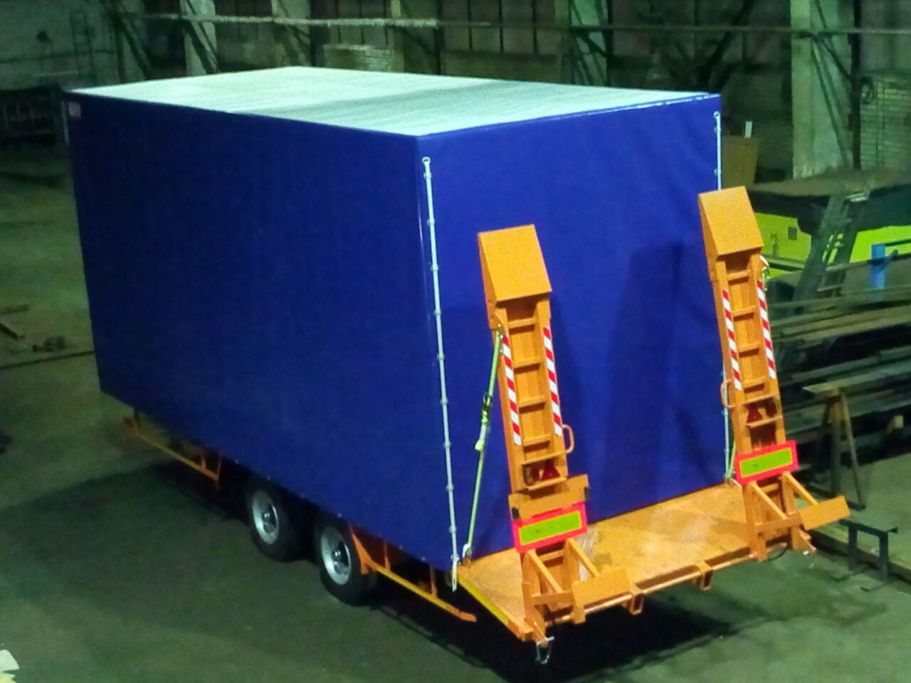 Прицеп штатно комплектуется: силовым ограждением грузовой платформы, проушинами для крепления груза, настил грузовой платформы металл, двумя въездными аппарелями 450мм. с возможностью регулировки по ширине.
