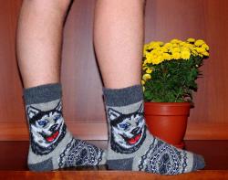 Купить оптом мужские вязаные носки из натуральной шерсти с рисунком волка, выполненные в серых тонах можно у нас. Идеальны не только для охоты, рыбалки, лыжного и конькобежного спорта, но и подходят для повседневной носки. Принимают форму ноги, не теряют форму после стирки, не пропускают лишние запахи и способствуют естественной терморегуляции.