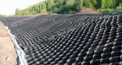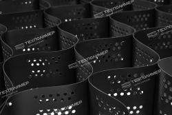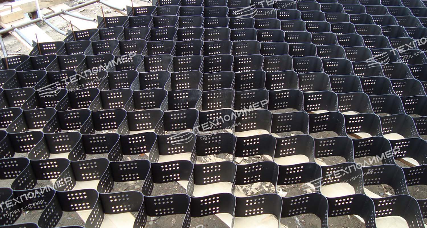 Объемная георешетка представляет собой сотовую конструкцию из полимерных полос, скрепленных между собой в шахматном порядке ультразвуковой сваркой. В растянутом состоянии образует объемную ячеистую структуру, которая предназначена для фиксации заполнителя (грунт, песок, щебень и т.д.).