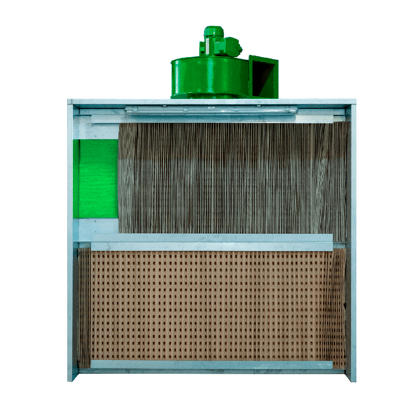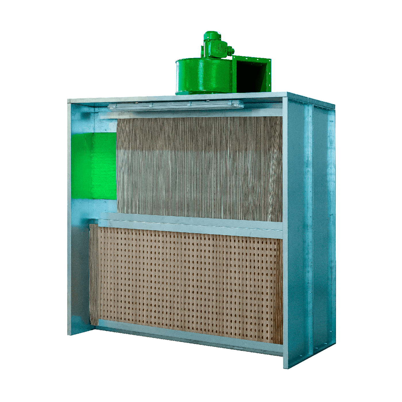 Двухступенчатая система фильтрации (картонный лабиринтный фильтр плюс стекловолоконный фильтр, степень фильтрации до 98%) позволяет существенно сократить выбросы вредных веществ в атмосферу, продлить срок службы вентилятора и снизить пожароопасность окрасочной кабины по сравнению с аналогами.