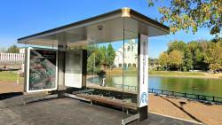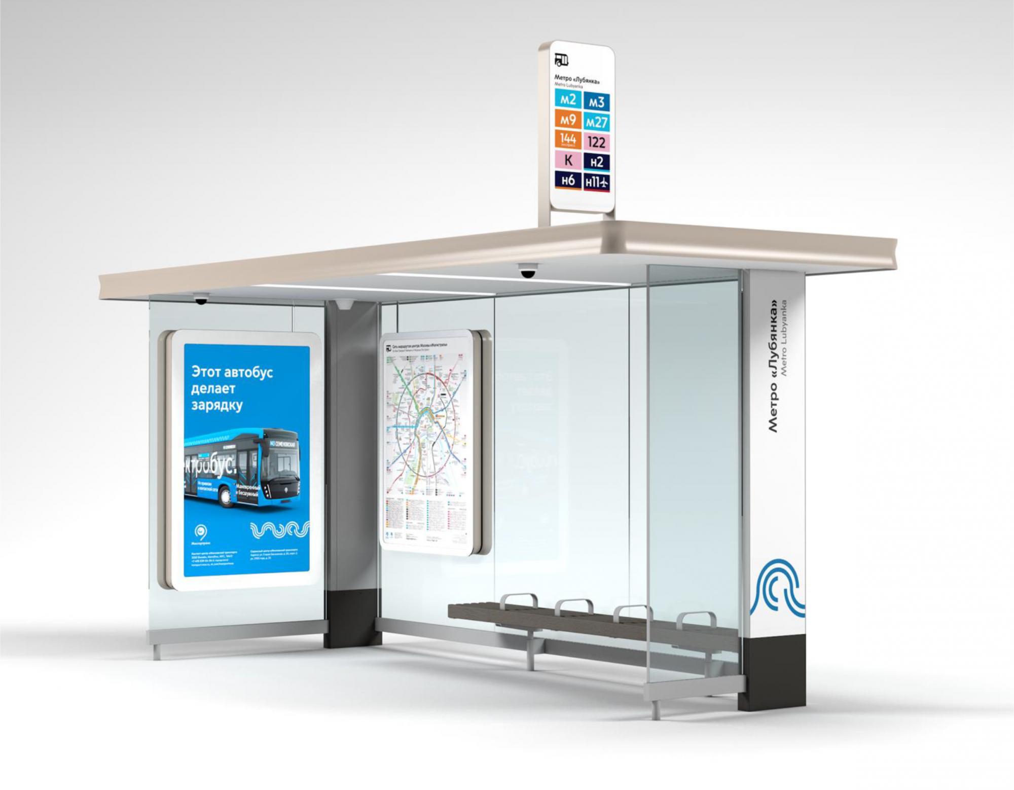 Павильон оснащен рекламными и навигационными лайтбоксами, лавочкой для отдыха пассажиров и встроенной USB зарядкой для мобильных телефонов.