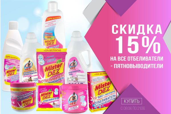 Условия акции: скидка 15% от базового прайса на отбеливатели Mister Dez