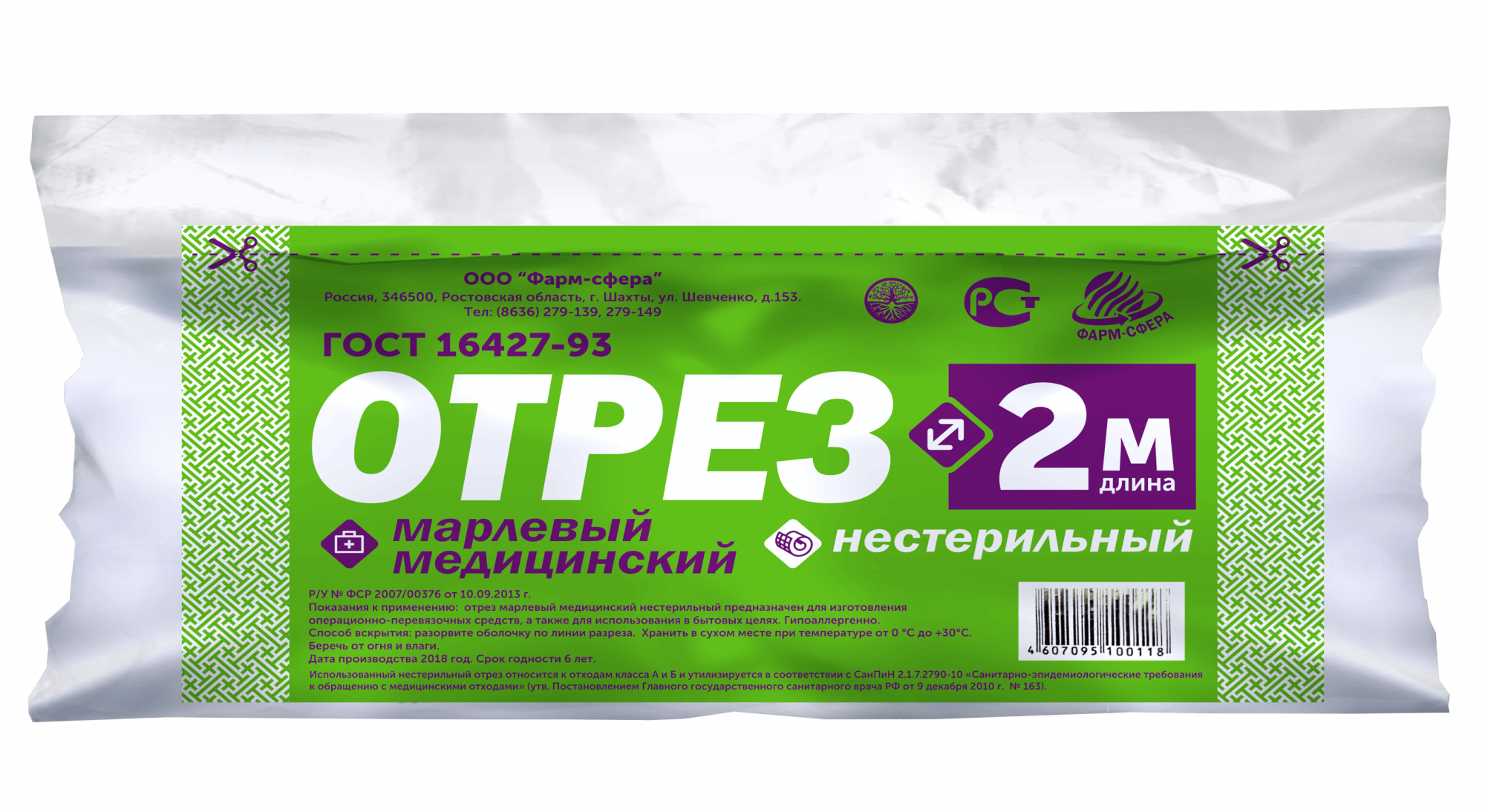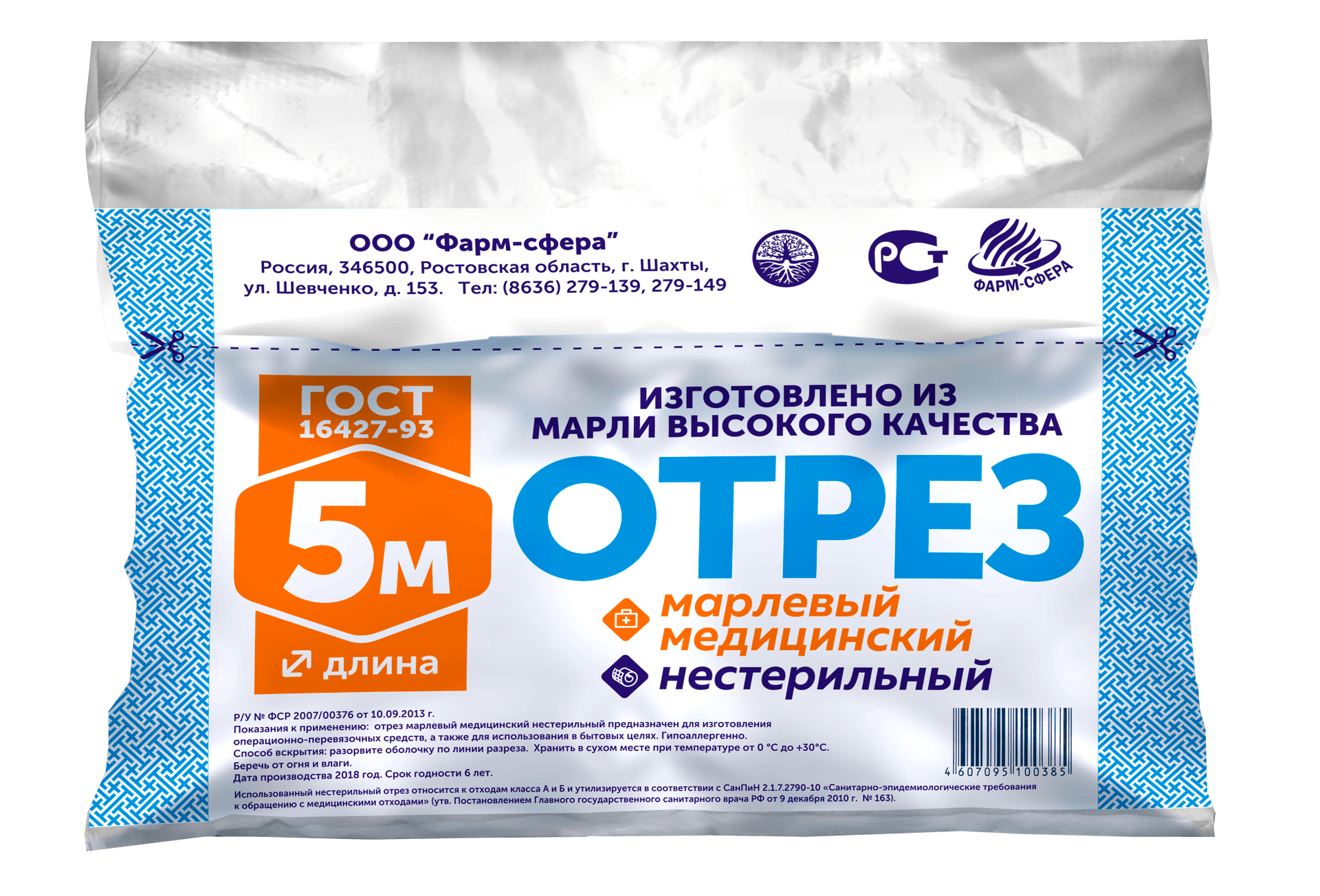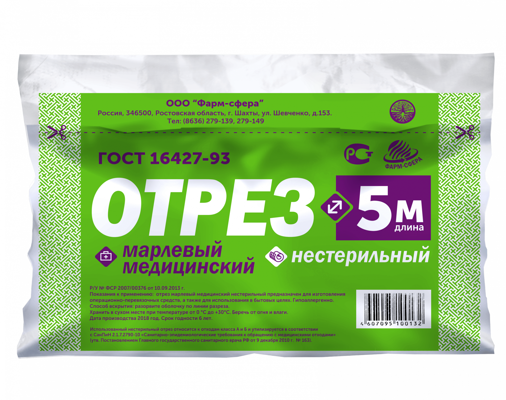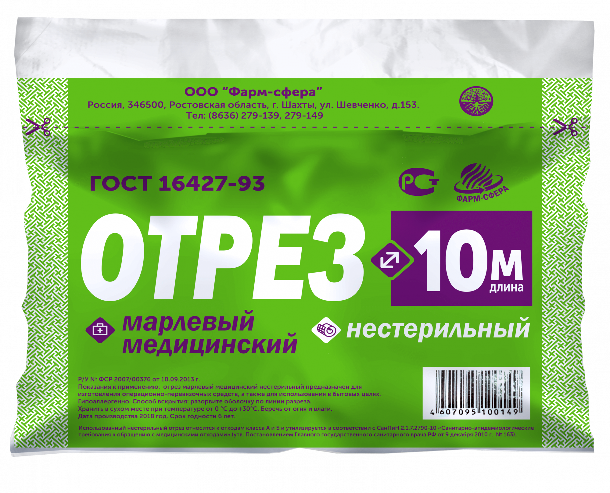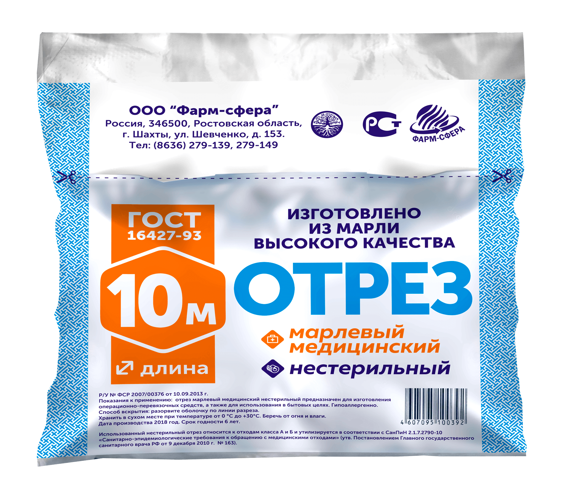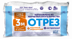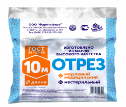 Марля медицинская нестерильная, хлопчатобумажная отбеленная. Отрезы сложены и упакованы в индивидуальной упаковке согласно ГОСТ 16427-93.