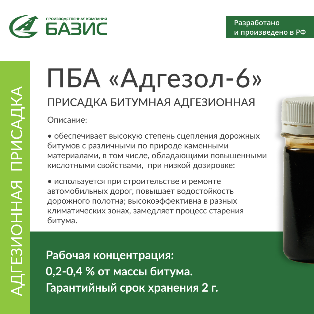 ПБА «Адгезол-6» – битумная адгезионная присадка представляет собой смесь алкиламидов жирных кислот и имидазолинов, изготовленную из отечественного сырья. Обеспечивает высокую степень сцепления дорожных битумов с различными по природе каменными материалами, в том числе, обладающими повышенными кислотными свойствами. Используется при строительстве и ремонте автомобильных дорог.