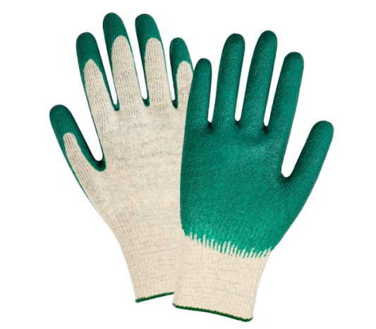 Перчатки рабочие, кругловязальные, трикотажные, х/б с одинарным латексным обливом : Тип вязки — кулирная гладь; Состав сырья — хлопок 100%; Цвет перчатки — суровый; Цвет латекса — зеленый; Обработка напульсника — термоспекаемая Х-нить; Цвет Х-нити — зеленый; Сорт — 1; Количество пар в упаковке — 200 пар; Вес единицы — 40 г ± 2 г; Вес упаковки — 8 кг ± 0,5 кг; Нанесения покрытия — Природный натуральный латекс один слой; ГОСТ 12.4.252.-2013. ТР ТС 019/2011 Степень защиты — от механических повреждений и общих производственных загрязнений