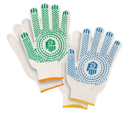 Перчатки рабочие трикотажные х/б, кругловязальные: Тип вязки — кулирная гладь; Состав сырья — хлопок 70%, полиэст 30%; Цвет перчатки — суровая; Обработка напульсника — термоспекаемая Х-нить; Цвет Х-нити — оранжевый, желтый; Сорт — 1; Количество пар в упаковке — 400 пар; Вес единицы - 50 г ± 2 г; Вес упаковки — 18,5 кг ± 0,5 кг; Нанесения точечного покрытия — Пластигерм 39 ГОСТ 12.4.252.-2013. ТР ТС 019/2011 Степень защиты — от механических повреждений и общих производственных загрязнений