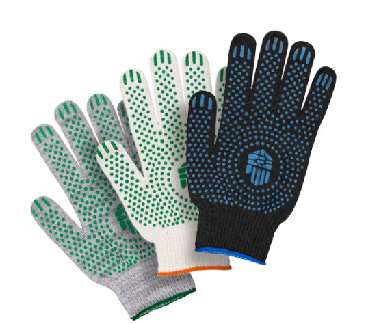 Перчатки рабочие трикотажные х/б, кругловязальные: Тип вязки — кулирная гладь; Состав сырья — хлопок 70%, полиэст 30%; Цвет перчатки — суровый, серый, черный; Обработка напульсника — термоспекаемая Х-нить; Цвет Х-нити — зеленый, оранжевй, синий; Сорт — 1; Количество пар в упаковке — 400 пар; Вес единицы - 46 г ± 2 г; Вес упаковки — 18,5 кг ± 0,5 кг; Нанесения точечного покрытия — Пластигерм 39 ГОСТ 12.4.252.-2013. ТР ТС 019/2011 Степень защиты — от механических повреждений и общих производственных загрязнений