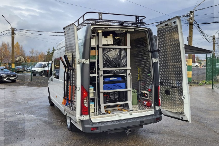 Тепло- и шумоизоляция салона Отделка стен и потолка композитом в рабочем отсеке, рифленым алюминием в грузовом отсеке Пол: влагостойкая фанера, напольное противоскользящее покрытие (промышленный линолеум) в рабочем отсеке, рифленый алюминий в грузовом отсеке Двери: боковая сдвижная с электроприводом, оббитая композитом и экокожей; задняя двустворчатая распашная с фиксаторами Дополнительный свет над боковой и задними дверьми Перегородка между кабиной водителя и пассажирским отсеком Металлическая перегородка с люком для длинномеров Выдвижной козырек над боковой дверью (маркиза) Багажник на крыше Лестница на задней правой двери