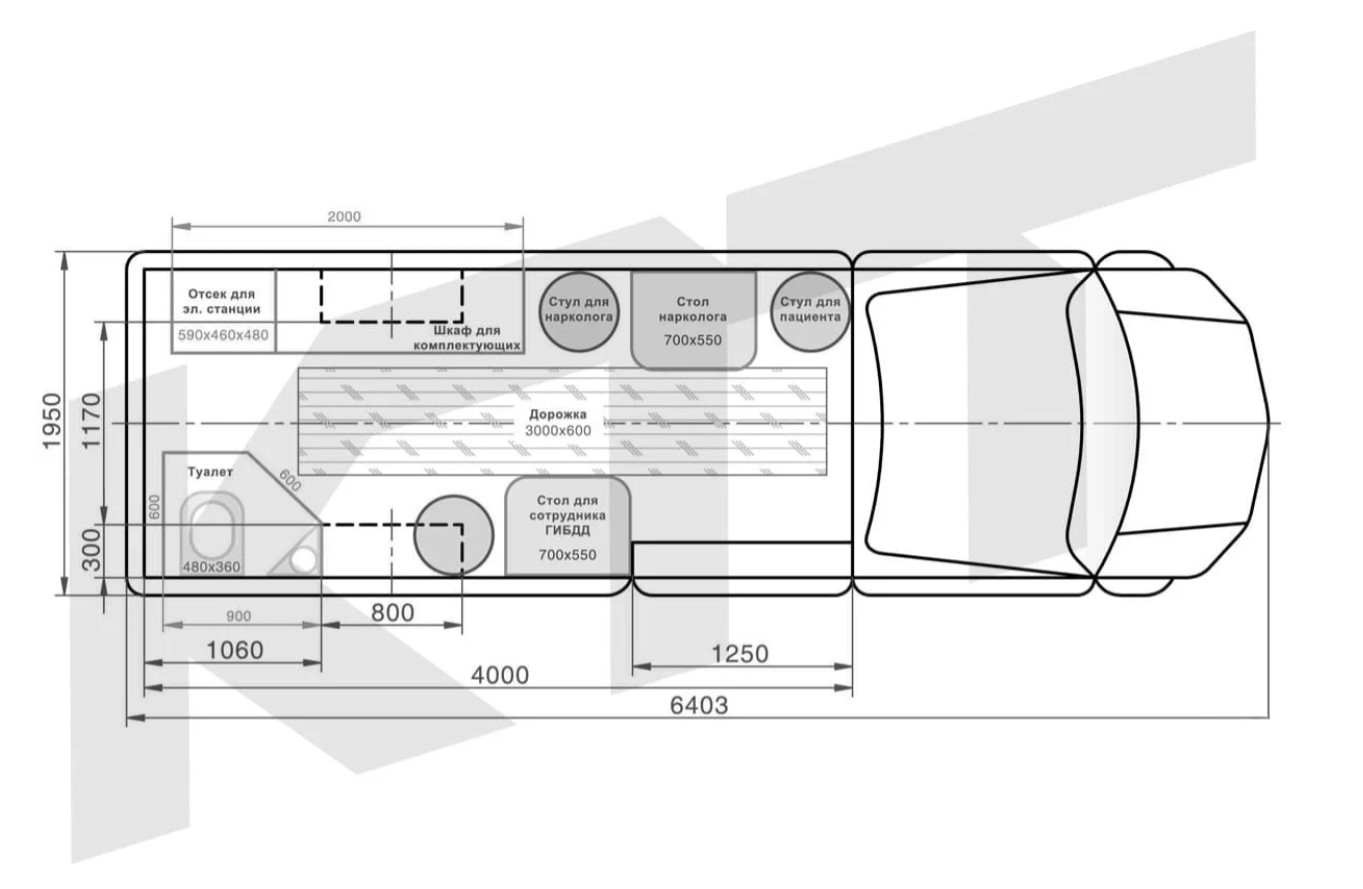 Средства связи (переговорное устройство кабины с фургоном) Бортовой холодильник Резиновая дорожка для проведения пробы на устойчивость походки Комплект средств для дезинфекции салона Рабочее место персонала: рабочие сиденья для мед. персонала 2 шт, сиденье для освидетельствуемого, рабочий стол для оформления актов и заполнения журнала, направленный светильник Мебель (шкафы, полки) с возможностью крепления оборудования Вешалка для верхней одежды Съемный пластмассовый (герметичный) мусоросборник