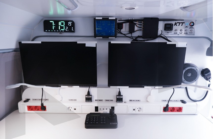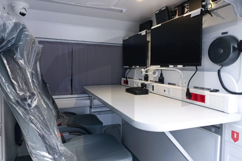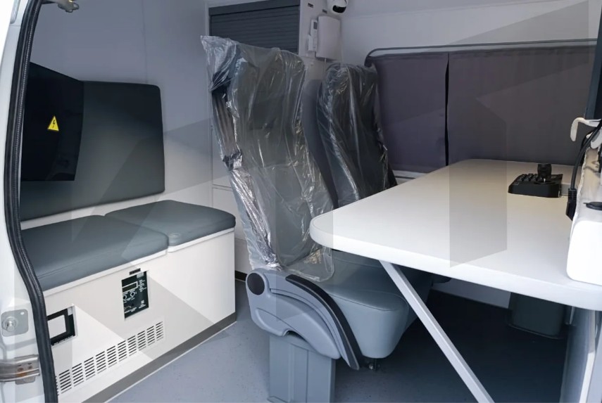 Рабочие места операторов БПЛА: столешница, кресла с регулируемой спинкой, оборудованные ремнями безопасности, подлокотниками Грузовой отсек: стеллаж для хранения и перевозки оборудования Антенная мачта Телескопическая мачта Метеостанция Система видеонаблюдения GSM-репитер (усилитель сигнала связи) с широкополосной нанаправленной внешней антенной