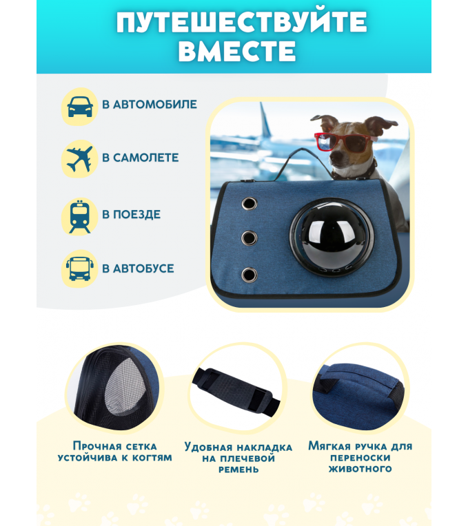Переноска для питомца с мягким каркасом. Переносная сумка, переноска для животных, переноска для кошек, переноска для собак – незаменимый помощник в транспортировке вашего питомца. Представленный цвет подойдет для перемещения, как в летнее, так и в зимнее время. В ассортименте переноска синего, серого цвета и цвета хаки. Идеальная переноска для животных: кошка, собака, кролик, котята, шиншилла, корги, щенки, собачки, шпиц, кот, грызуны, басик, мелкие породы собак, средние, крупные, большие породы кошек. Переноска для животных предназначена для переноски кошек и собак до 10 кг. Переноска для кошек, переноска для собак незаменима в путешествиях, в поездке к ветеринару и транспортировке на любые расстояния. Переноска для кошек отлично подойдет в автобус, поезд, авто. Мягкая переноска для кошек, переноска для самолета, кошачья переноска очень компактна и не займет лишнего места дома. Отличительная особенность переноски бренда mimiZOO – универсальность, мобильность и многофункциональность. Переноска для кошки, переноска для кошек, кошачья переноска может быть использована как дом для кошек, дом для кошки, дом для кота. Сумка переноска для животных легкая и удобная в использовании. Водонепроницаемая сумка выполнена из износостойкого, плотного, амортизирующего, не вызывающего аллергии материла Оксфорд, устойчивого к температурам. Материал не создает приятную среду для микроорганизмов, поэтому на нем никогда не встретишь плесень или грибок. Так что ваш питомец в переноске для кошек будет чувствовать себя в безопасности! Материл Оксфорд хорошо чистится, стирается, не оставляет зацепок. Рекомендуемый режим стирки 30 градусов. Крепкое и мягкое дно вынимается на случай стирки. Наличие надежной фурнитуры, прочных молний предотвратят непреднамеренный побег животного. Кошачья переноска, сумка переноска для кота, переноска для кошек topcase оснащена иллюминатором из пластика, так что Вашему питомцу не будет скучно во время путешествия. Удобная прочная ручка сверху облегчит транспортировку питомца. Прочный отстегивающийся ремень через плечо с регулировкой позволит освободить ваши руки. Перед первым использованием рекомендуем проветрить сумку переноску, переноску для кошек, переноску для собак в течение 1-2 дней на свежем воздухе (в разобранном виде) от остаточных производственных запахов. Переноска для кошек, переноска для животных, сумка переноска, рюкзак переноска, слинг переноска – это отличные новогодние подарки, новогодние подарки 2023, подарок на новый год, подарок к новому году. Все товары для собак и зоотовары для кошек имеют размер, поэтому перед покупкой рекомендуем измерить параметры Вашего любимца. В знак благодарности, что Вы приобрели переноску нашей компании, мы вложили подарок - расчёску для вашего питомца! Закажите сумку переноску, переноску для кошек, переноску для собак прямо сейчас и путешествуйте с питомцем комфортно!