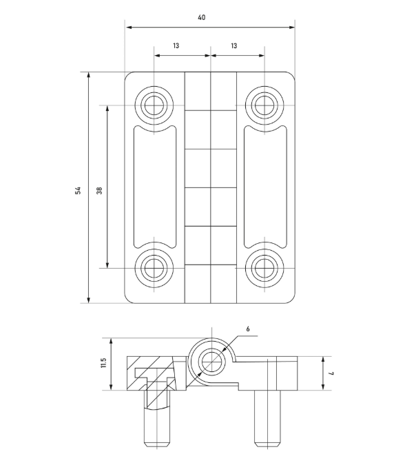 Петля листовая 40х54мм со шпильками М6х11, цвет чёрный, материал корпуса - сплав ЦАМ, материал штифт - оцинкованная сталь, в комплект входят гайки М6 с прессшайбой - 4шт. Вес: