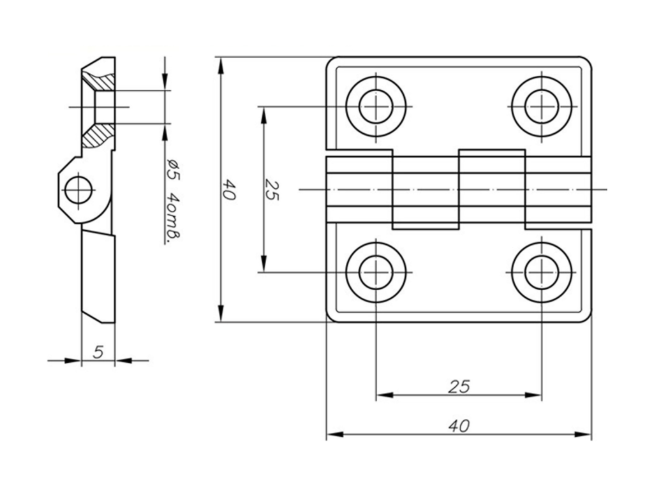 Петля листовая 40х40мм с отверстиями М5, цвет хром, материал корпуса - сплав ЦАМ, материал штифт - оцинкованная сталь.