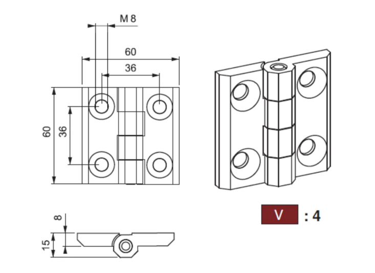 Петля листовая 60х60мм с отверстиями М8, покрытие хром, материал корпуса - сплав ЦАМ, материал штифт - оцинкованная сталь