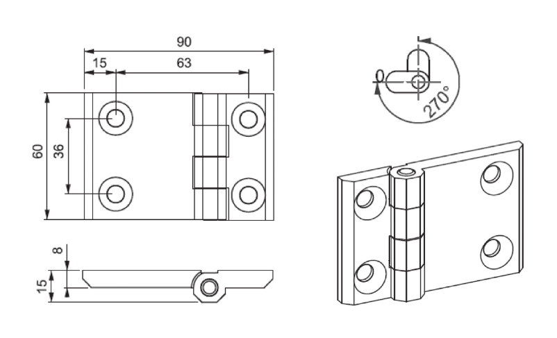 Петля листовая 60х90мм с отверстиями М8, цвет чёрный, материал корпуса - сплав ЦАМ, материал штифт - оцинкованная сталь, вес 196 гр.
