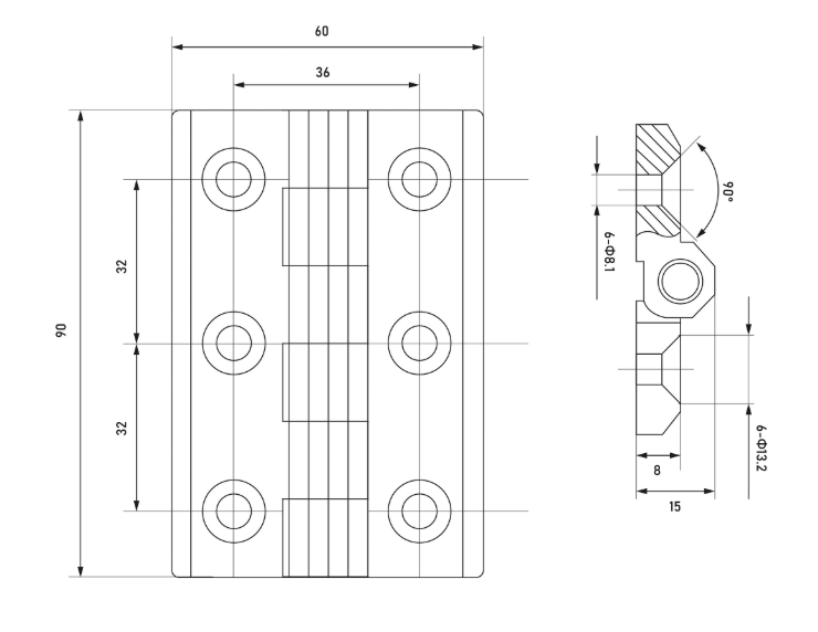 Петля листовая 60х90мм с отверстиями М8, цвет чёрный, материал корпуса - сплав ЦАМ, материал штифт - оцинкованная сталь. Размер отверстий под болт потай 8*13 мм