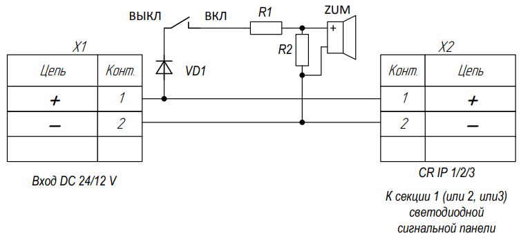 Плата звукового сигнала ПЗС-24/12 подключается в цепь общий провод / провод выбора цвета (например, красный) параллельно или в разрыв между цепью питания и панелью