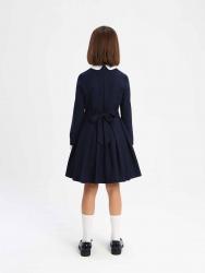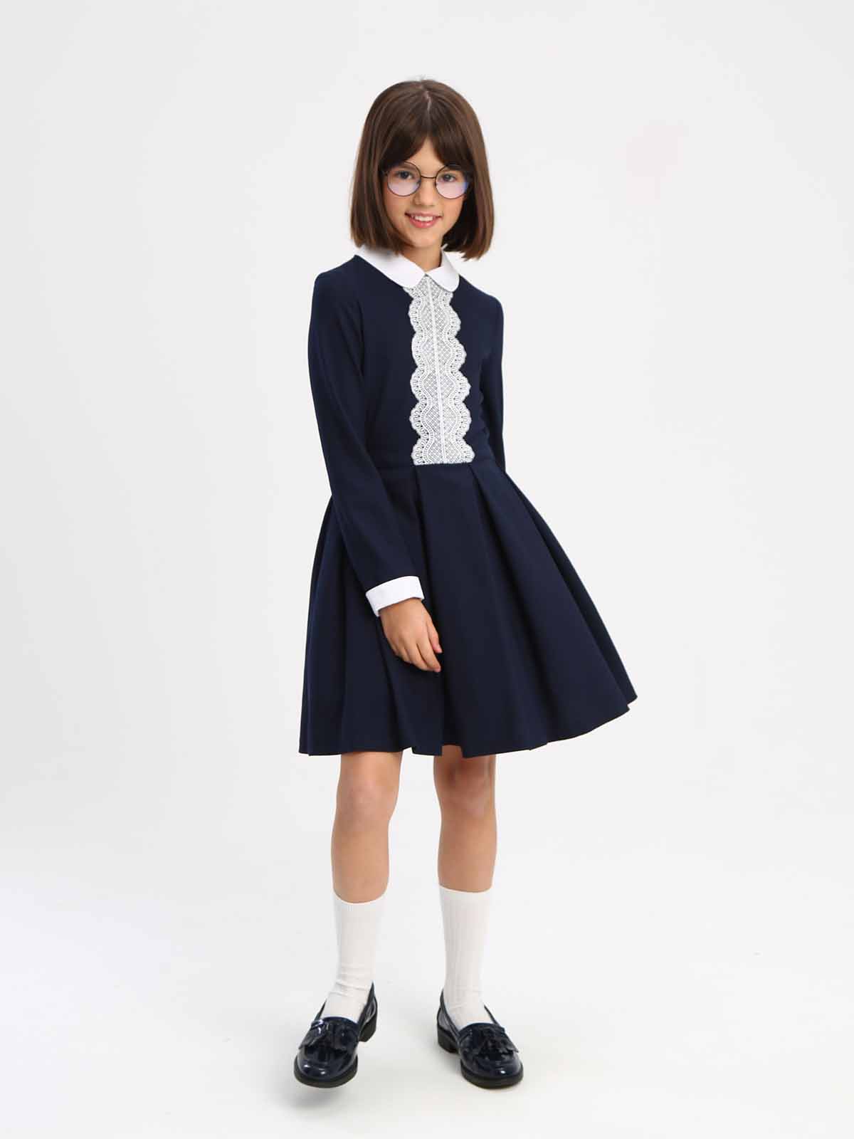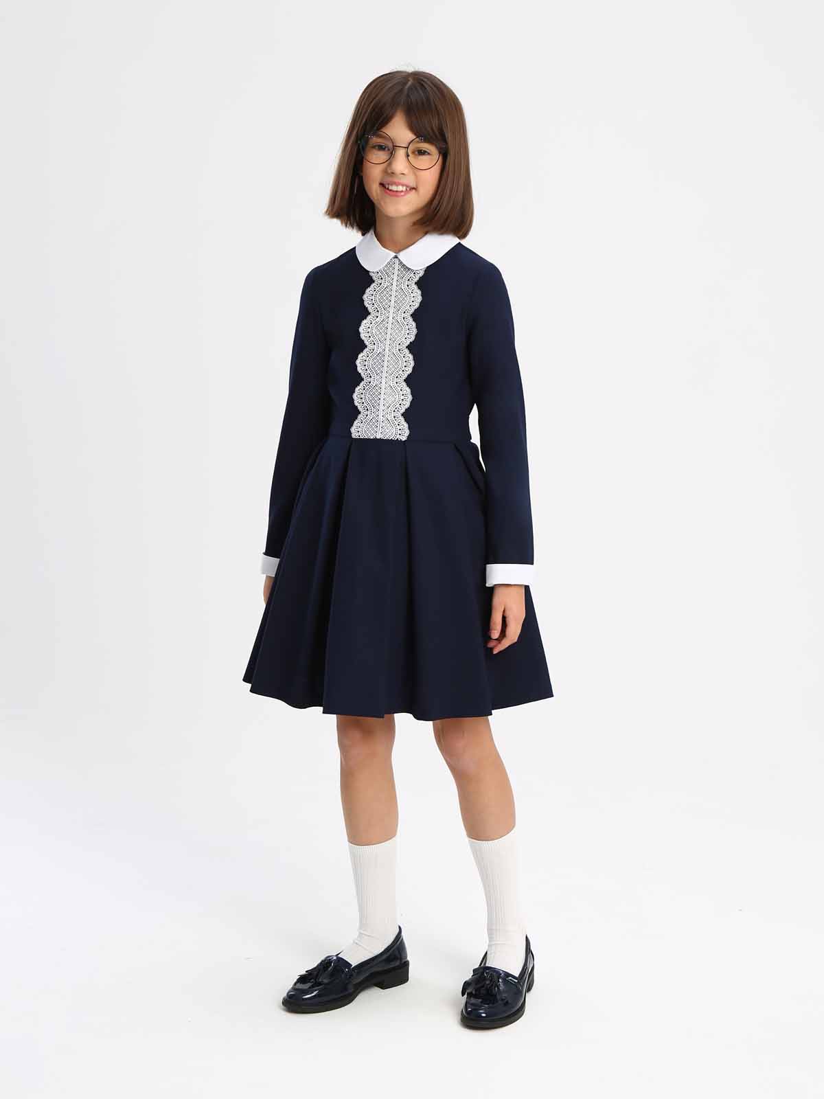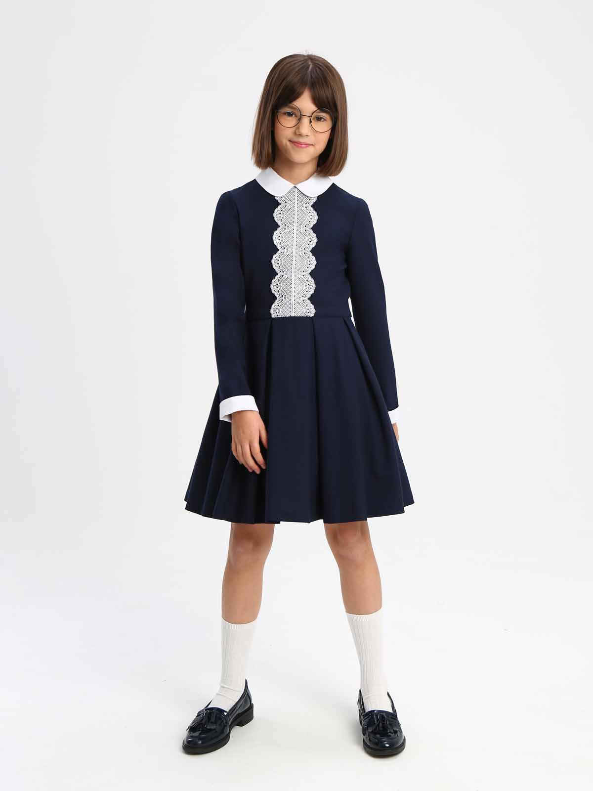 Эффектное платье А-силуэта со съемнвым воротником, контрастного белого цвета. С длинными втачными рукавами со съемными манжетами белого цвета, и юбкой колокол с мягкими складками. В боковых швах юбки расположены карманы.. Полочка декорирована кружевной аппликацией контрастного цвета Платье выполнено из износостойкой костюмной поливискозы с добавлением эластичных волокон, обеспечивающих комфорт в движении. Потайная молния на спинке - удобная застежка, с которой справится даже первоклашка. В комплекте предусмотрен съемный подъюбник на пуговицах.